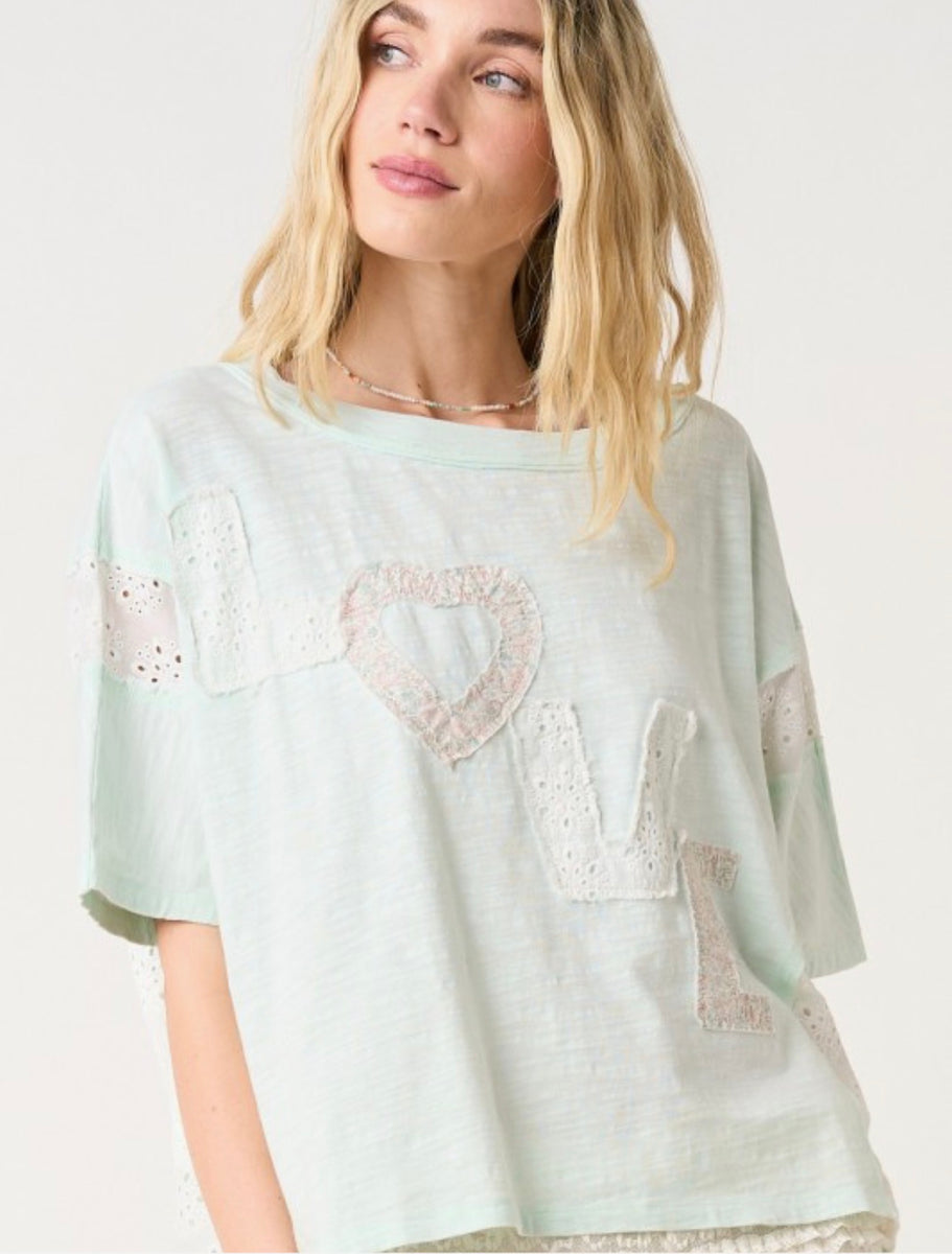 The 15748 features a relaxed fit with a charming ice mint appliquéd "love" design, adding a playful touch to your wardrobe. The eyelet detailing enhances breathability, making it a comfortable choice for any casual occasion.