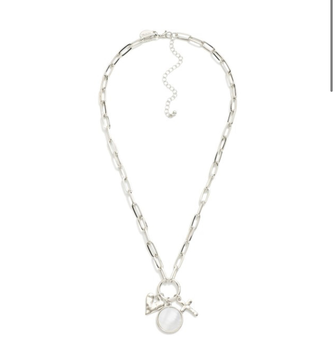 Paperclip Chain Link Necklace Featuring Metal Tone Hoop Pendant With Cross, Heart & Pearl Charms