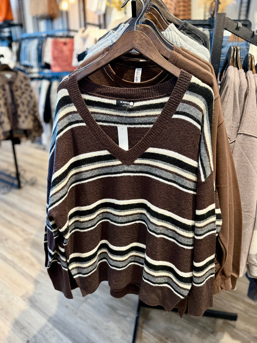 Stay cozy and stylish with our 1947 brown v neck stripe pullover sweater. Made with comfort in mind, this sweater is the perfect addition to your wardrobe. Its v neck design and striped pattern add a touch of sophistication to any outfit. Stay warm and fashionable with this must-have piece.