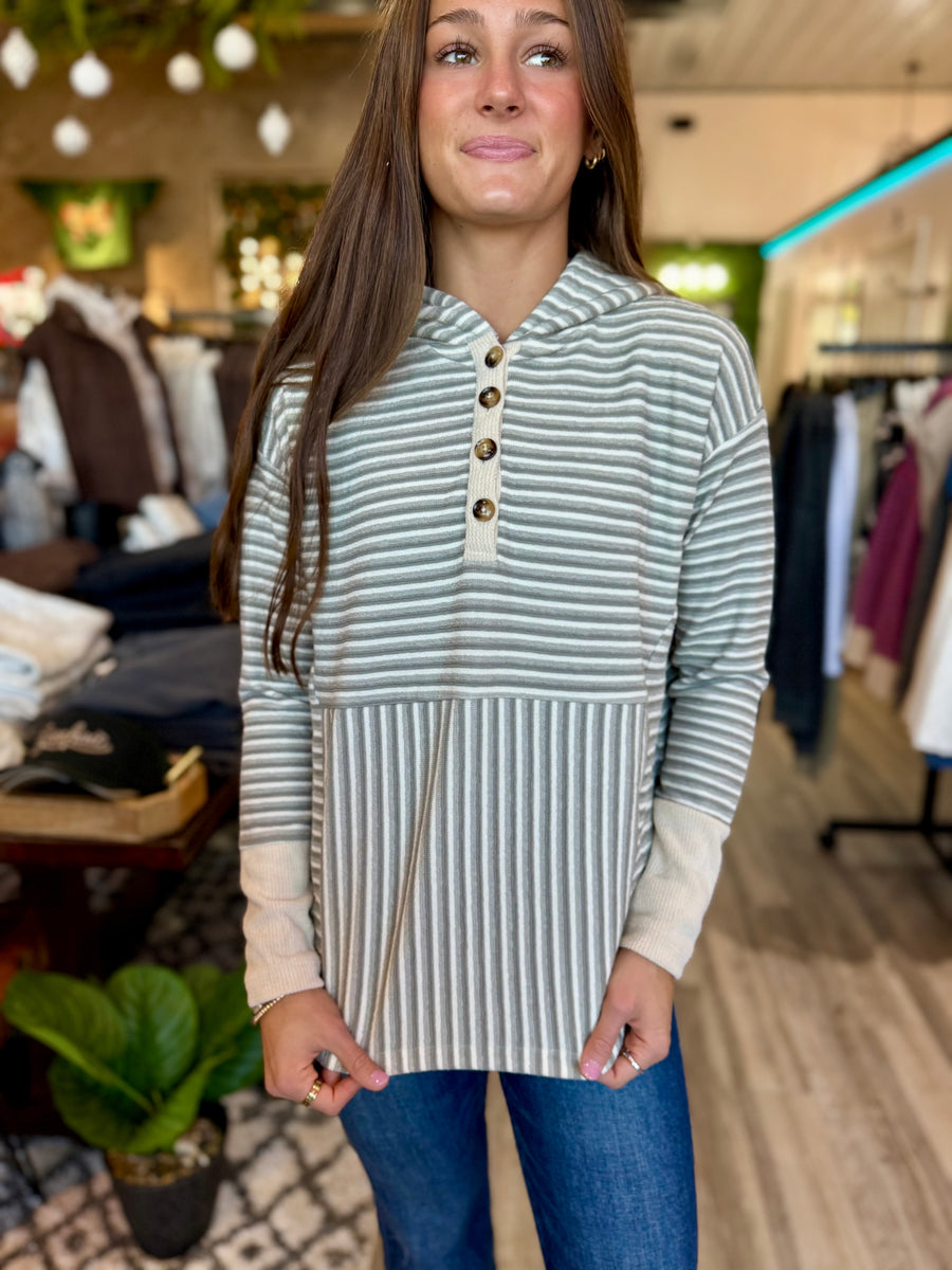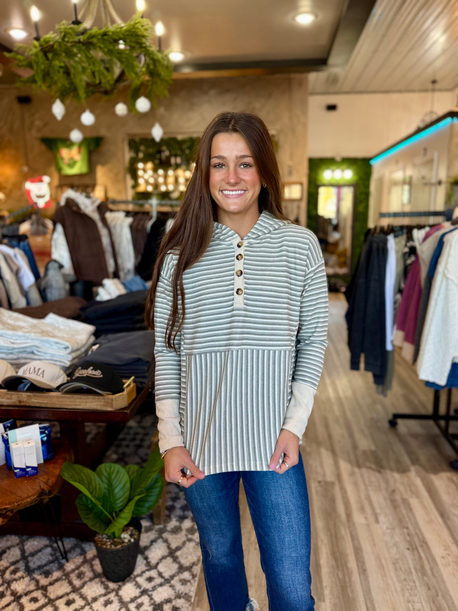 Stay cozy and stylish in our Sage Green Hoodie. With a convenient front button design and cozy stripe pattern, this hoodie is the perfect addition to your wardrobe. Perfect for chilly days, this hoodie will keep you warm and on-trend no matter where you go.