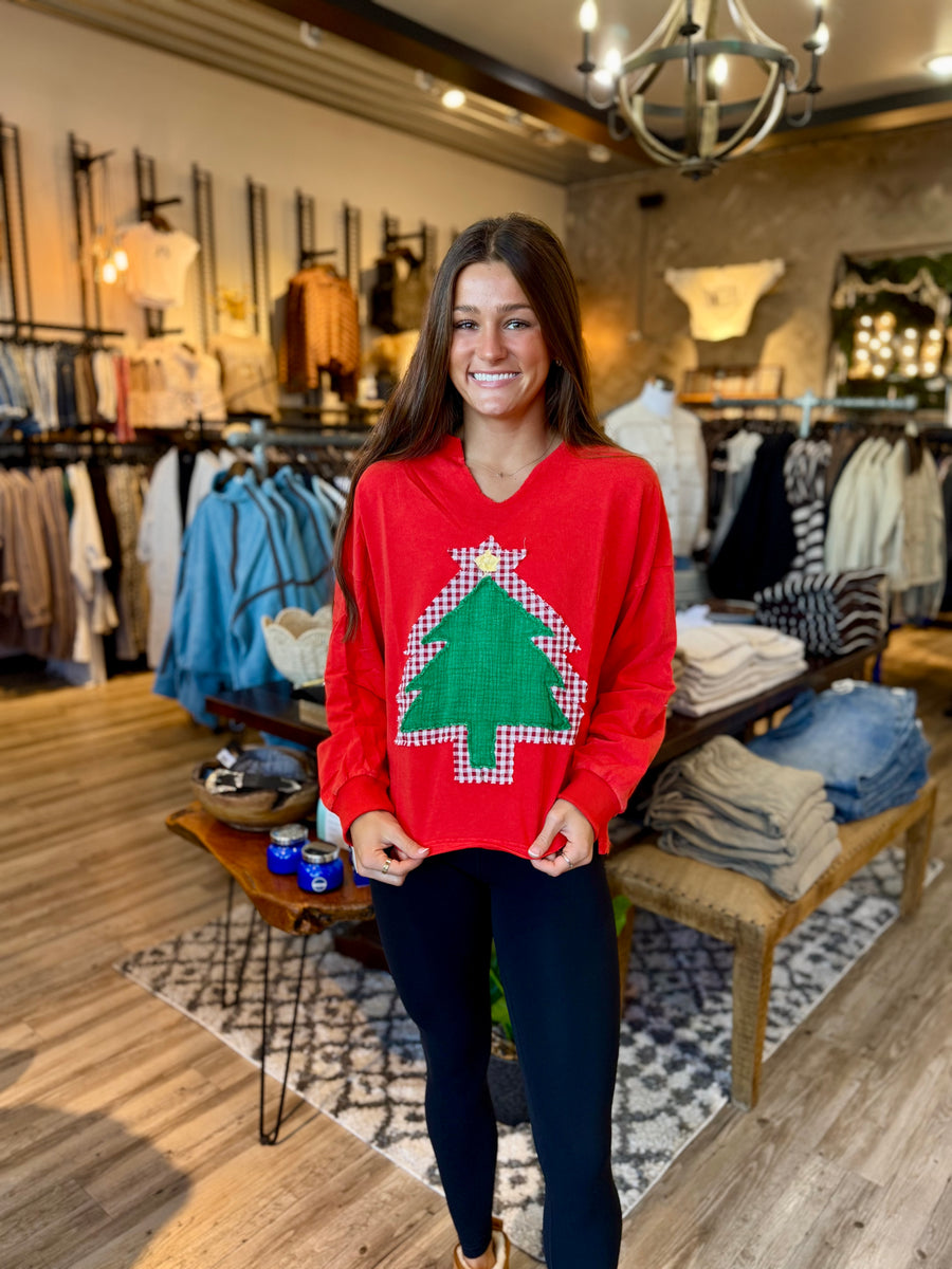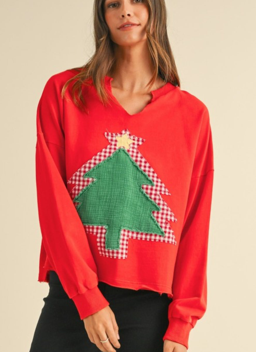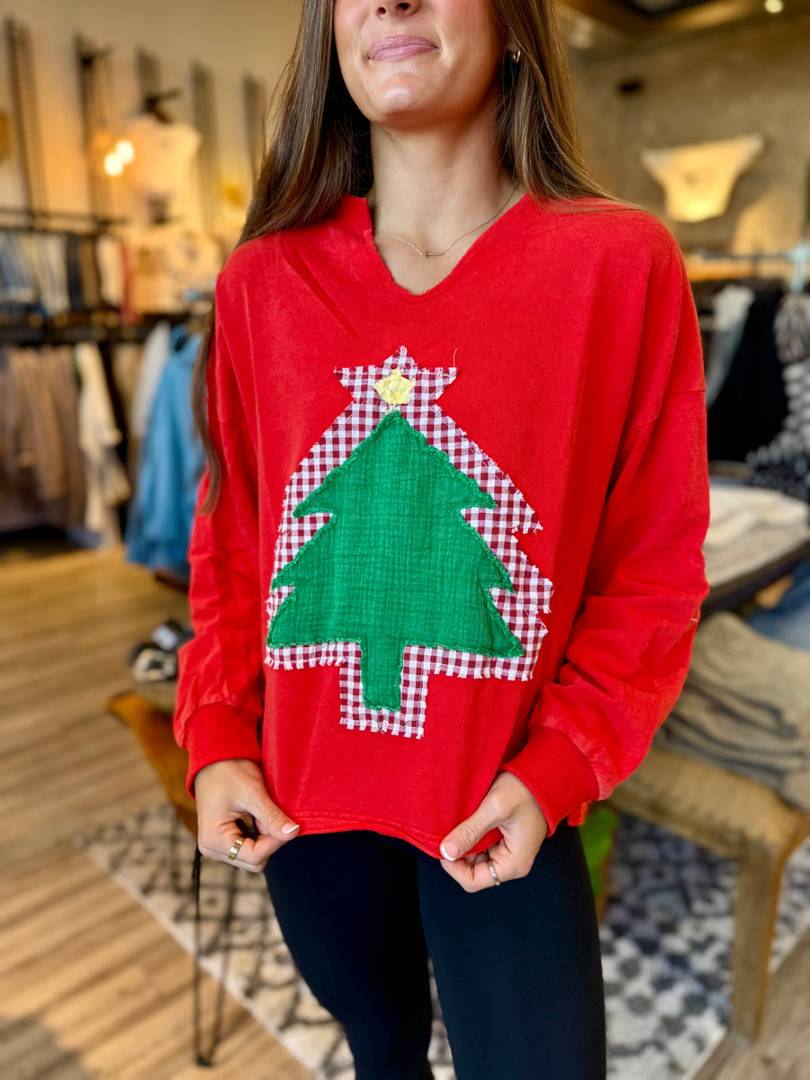This French Terry pullover features a bold red mineral wash and a unique tree patch. Stay cozy and stylish in this eye-catching design.