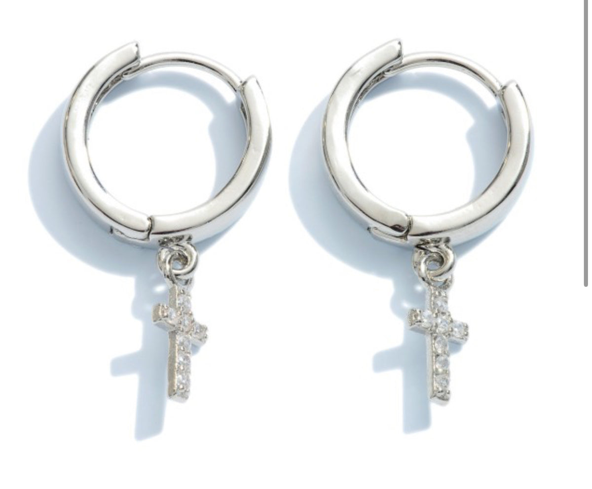 Pave Cross Huggie Hoop Earrings.- Approximately .5" in Hoop Diameter- Approximately 1" in Length