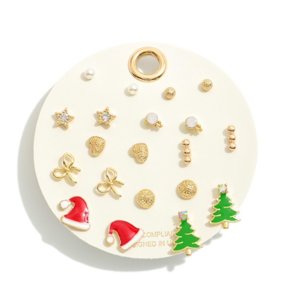 Set of 10 Christmas Themed Stud Earrings- Approximately 0.1-0.75" L