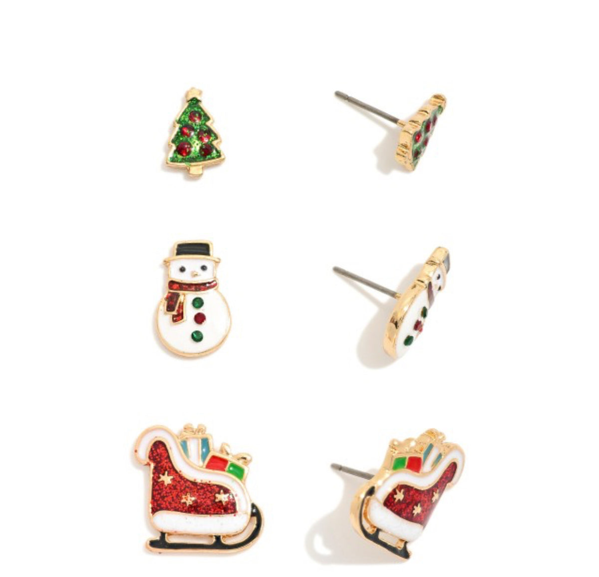 Set Of Three Christmas Stud Earrings Featuring Glitter & Rhinestone Details - Approximately .5" L