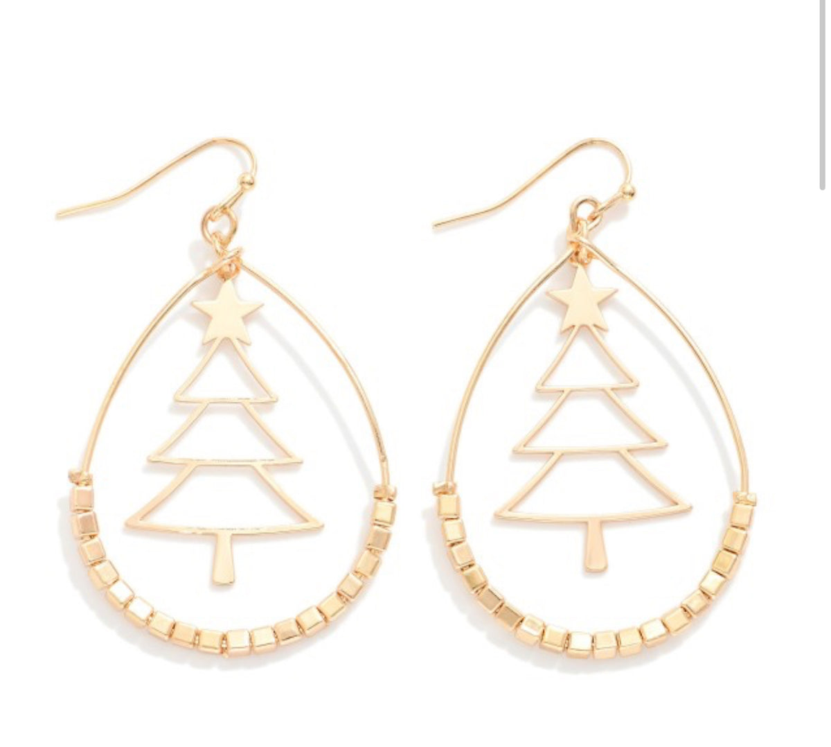 Beaded Teardrop Earrings Featuring Metal Tone Christmas Tree Detail - Approximately 2" L
