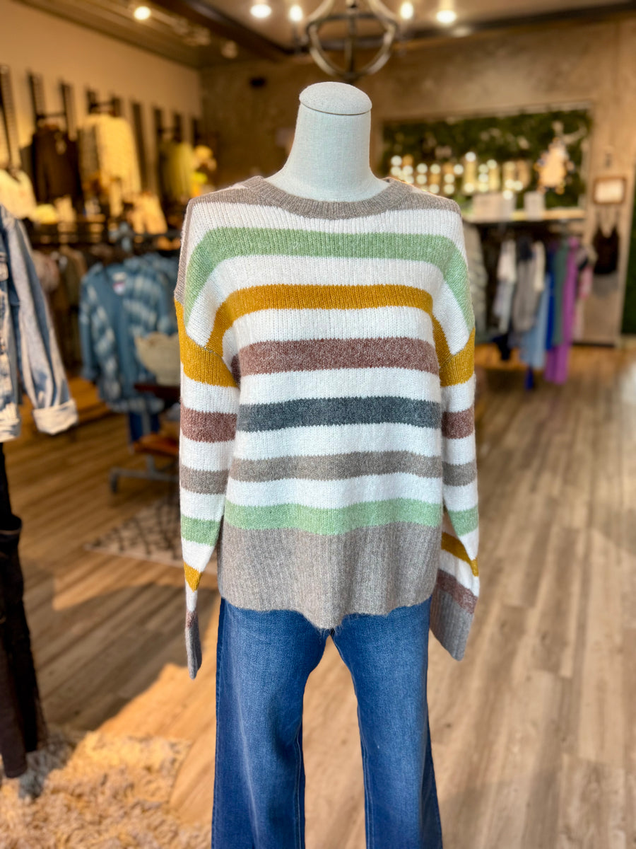 Effortlessly stylish and cozy, our Multi Stripe Pullover Sweater is the perfect addition to your wardrobe. With its eye-catching multi stripe design, this sweater will keep you warm and on-trend. Made with high-quality materials, it offers comfort and durability for everyday wear. Elevate your look with this must-have piece.