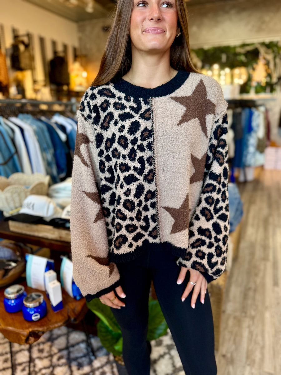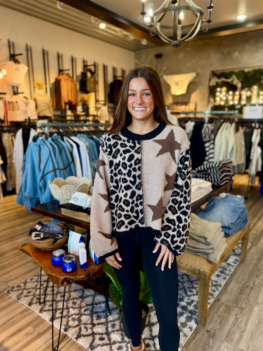 Introducing our newest addition, the 40609 sweater! Crafted with a super soft fabric, this charming leopard and star tan sweater not only keeps you warm, but also adds a touch of style to your wardrobe. Make a statement while staying cozy with this must-have piece.
