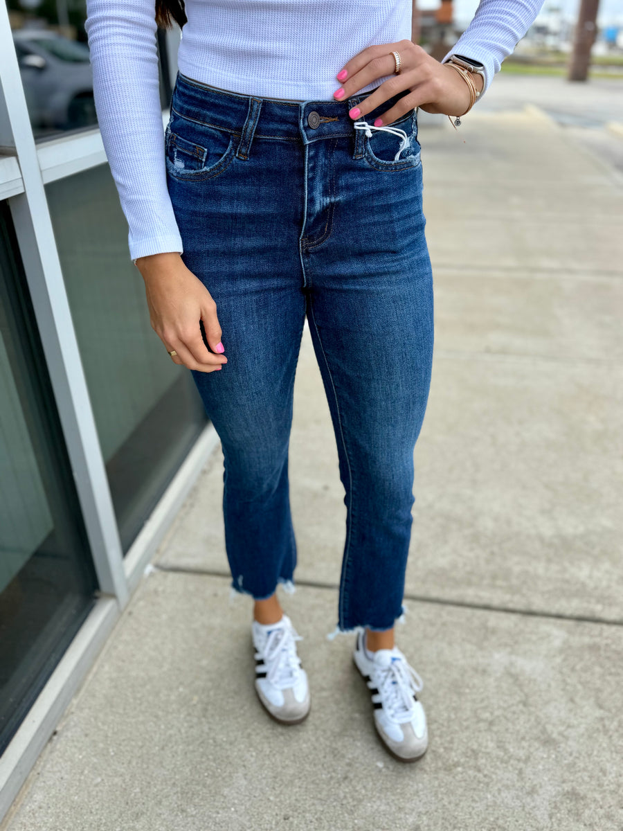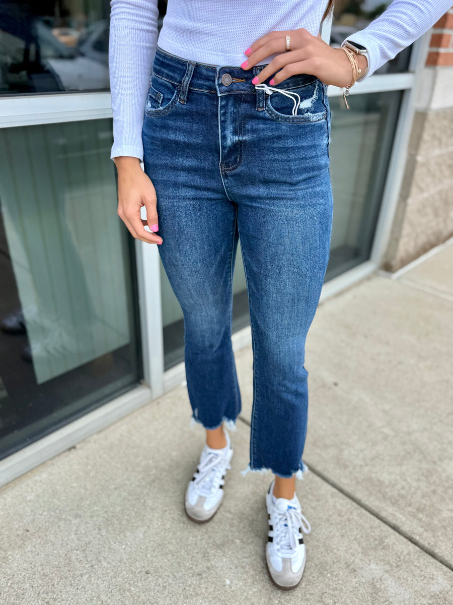 Elevate your denim game with Vervet by Flying Monkey's high-rise raw hem kick flare jeans. The stretchy fit and 10.5" rise offers a comfortable and flattering fit, while the 27" inseam adds a touch of vintage style. Perfect for any occasion.