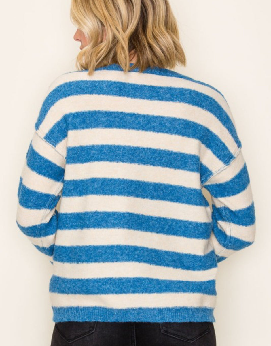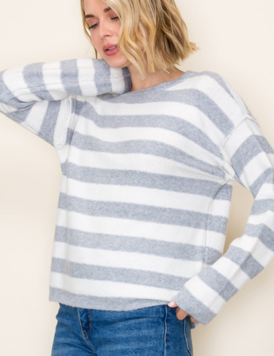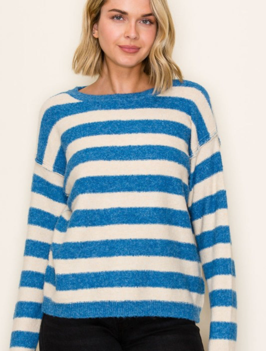 Stay cozy and stylish with our 55300 pullover sweater, now available in blue, gray, or tan stripe. Perfect for any occasion, this sweater will keep you warm and looking great.