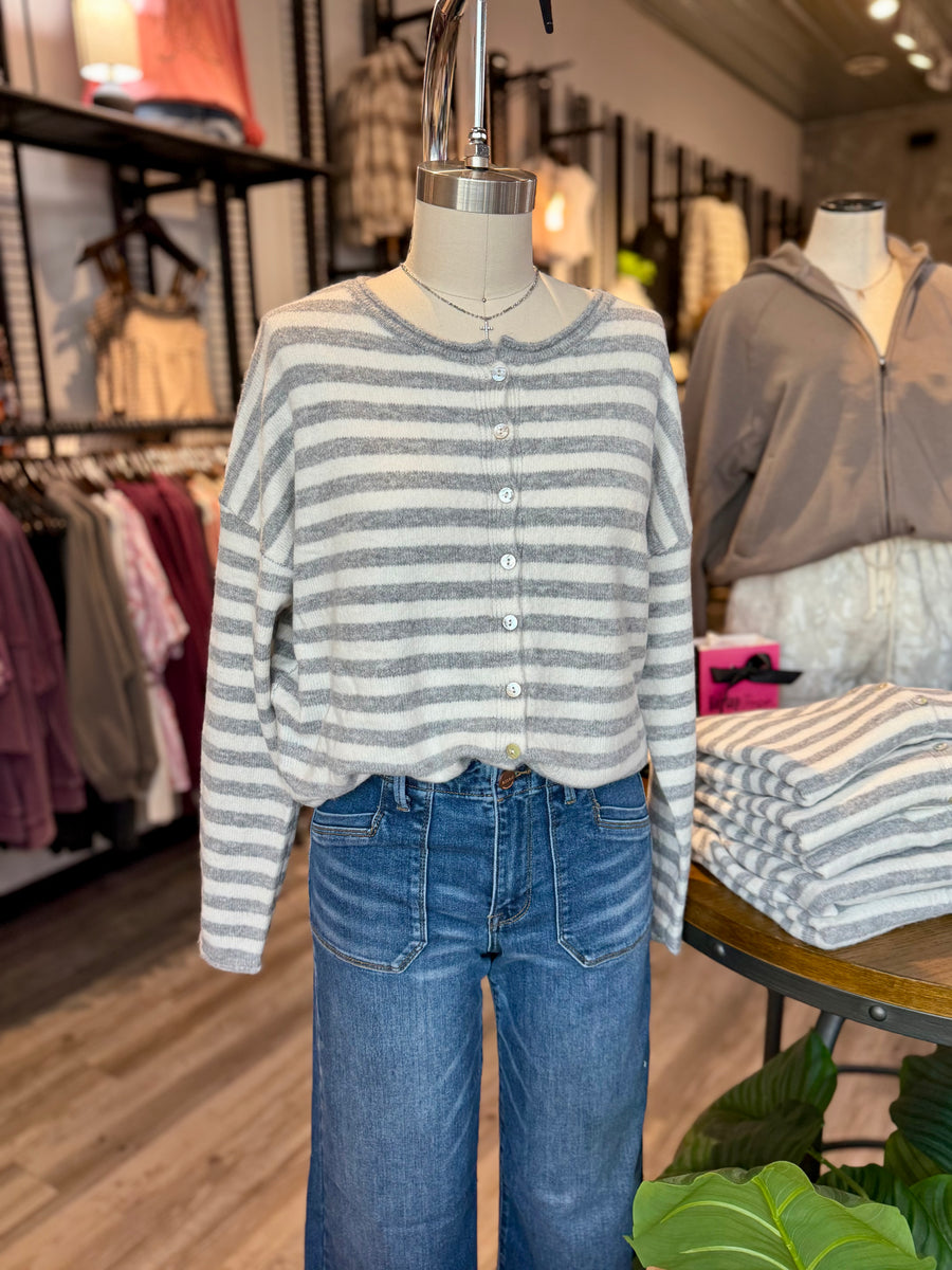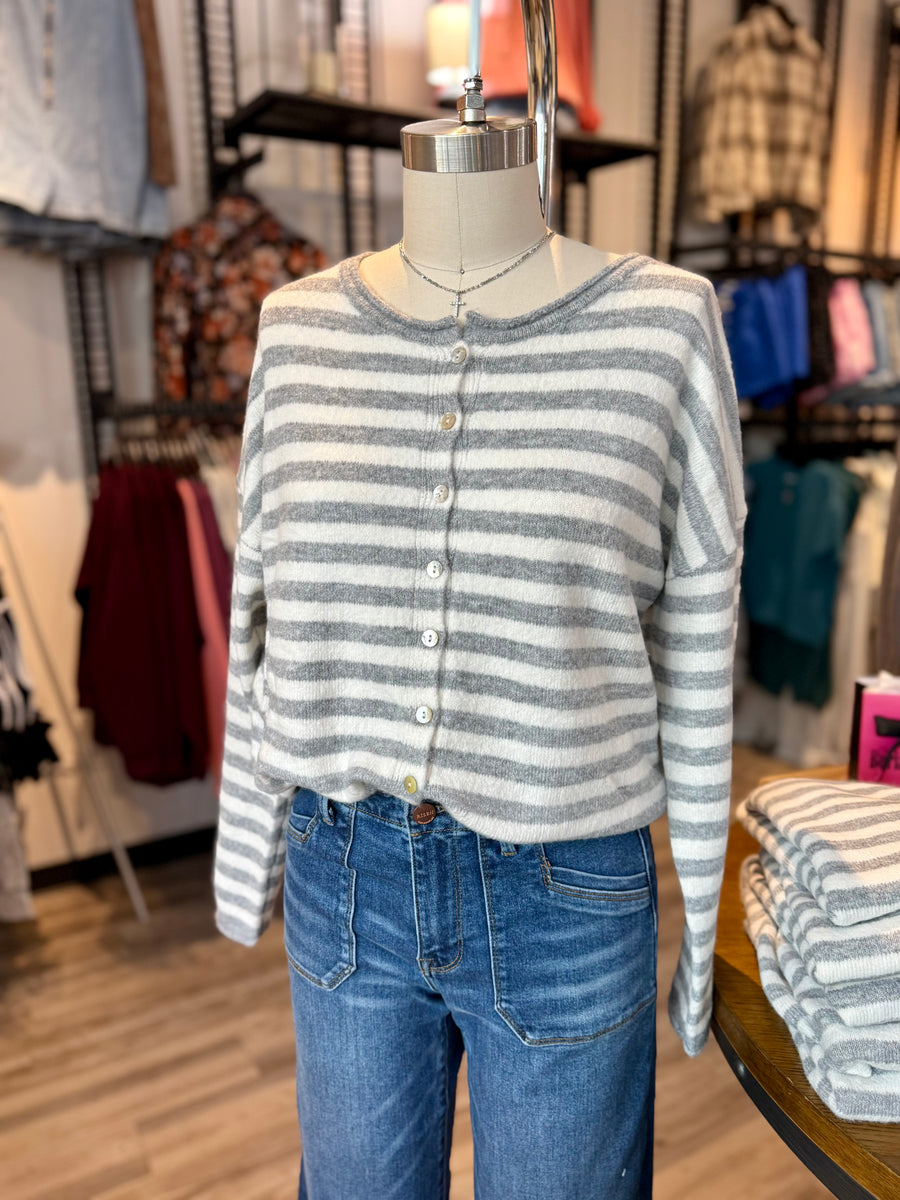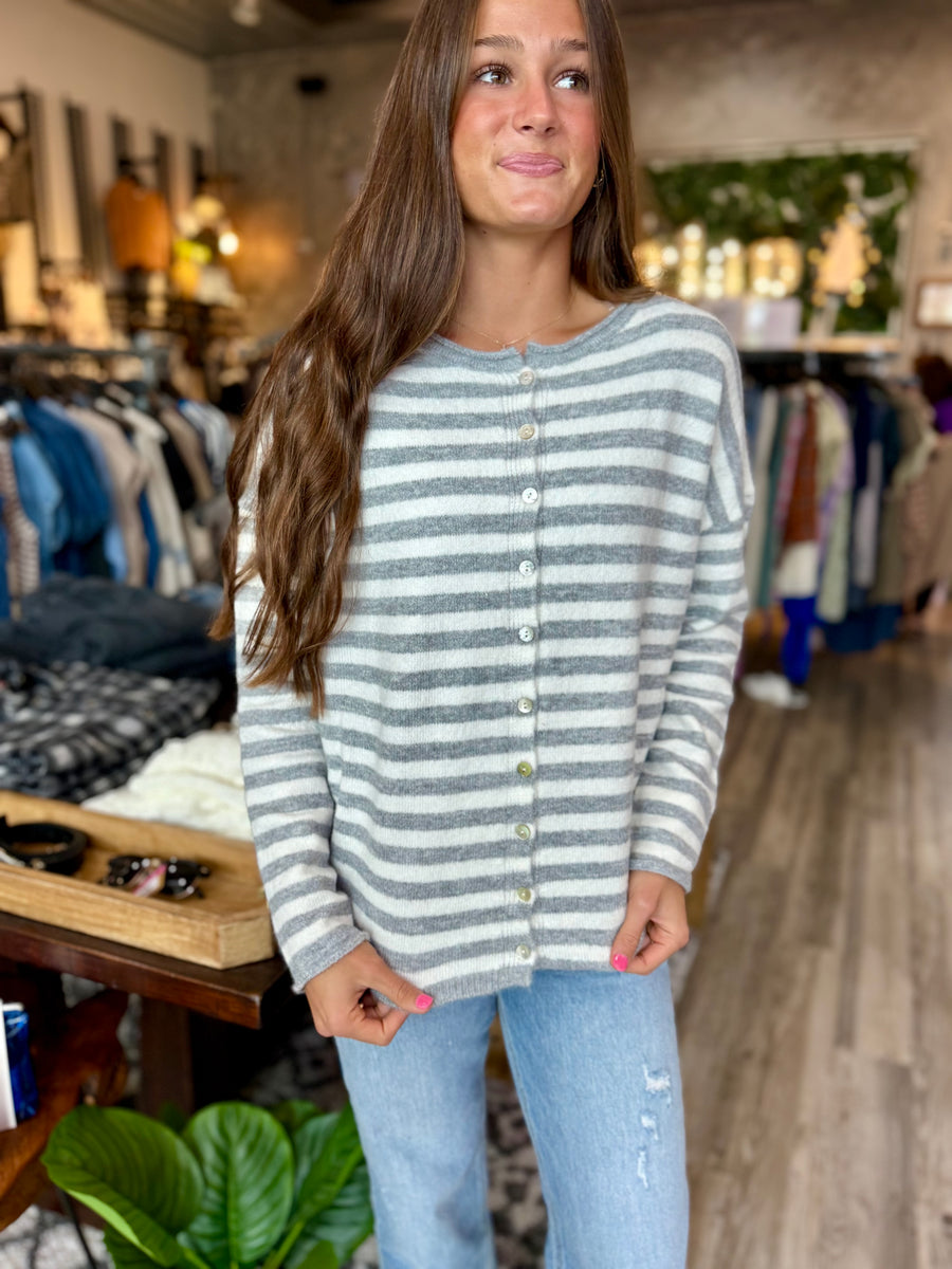 This stylish cardigan features a classic heather gray and ivory stripe design and a button-down front. The perfect addition to any outfit, this cardigan offers both comfort and sophistication. Made with high-quality materials, it's sure to become a staple in your wardrobe.