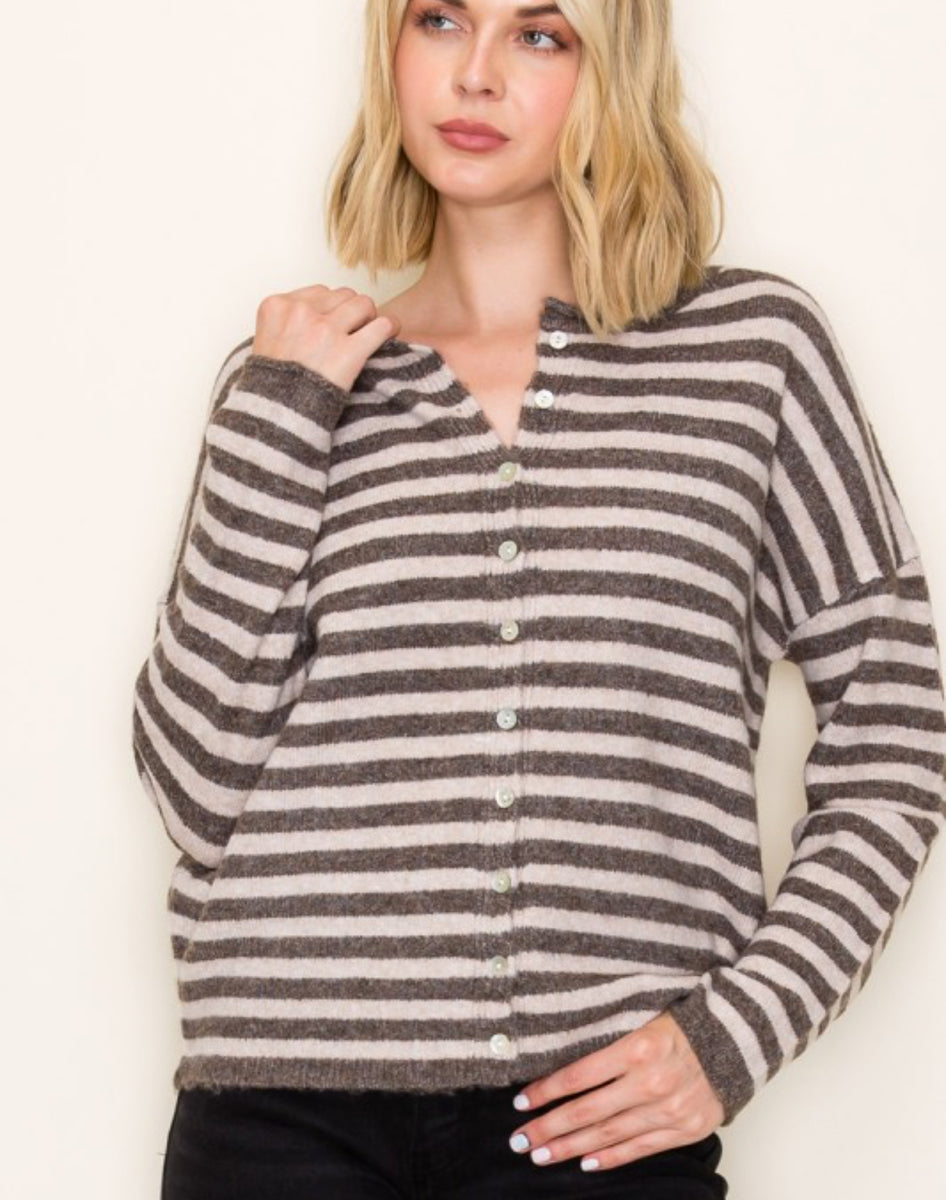 This stylish cardigan features a classic brown and tan stripe design and a button-down front. The perfect addition to any outfit, this cardigan offers both comfort and sophistication. Made with high-quality materials, it's sure to become a staple in your wardrobe.