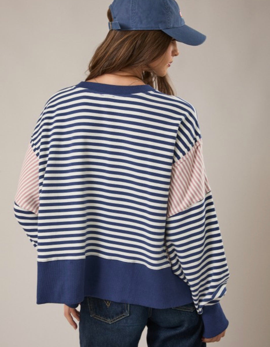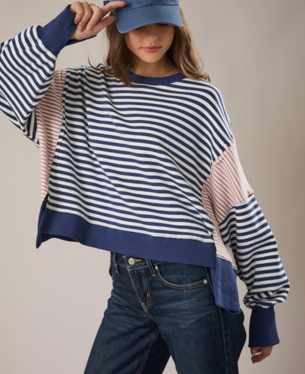 The 7159 pullover features a relaxed fit with navy and ivory stripes, perfect for casual outings. Its comfortable design allows for easy movement, making it an ideal choice for laid-back days. Enjoy both style and comfort with this versatile wardrobe staple.