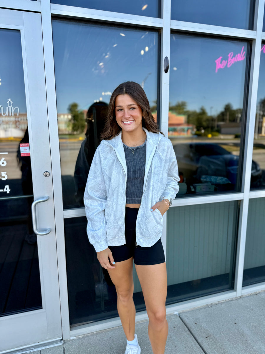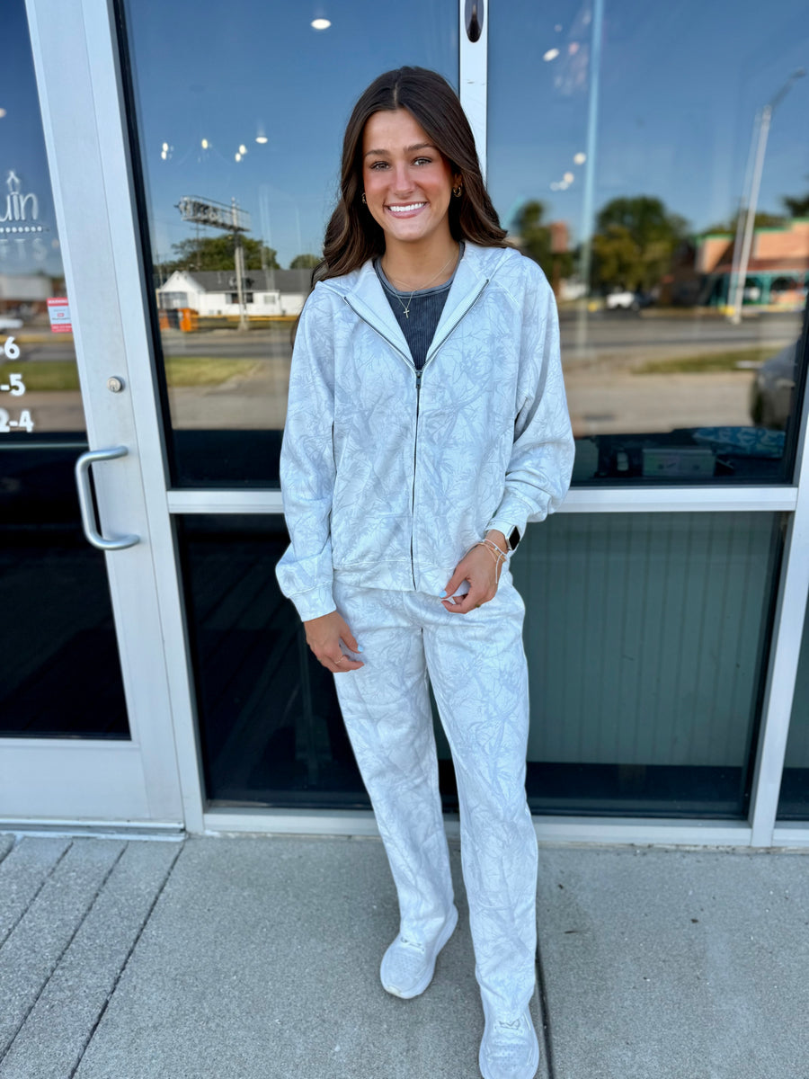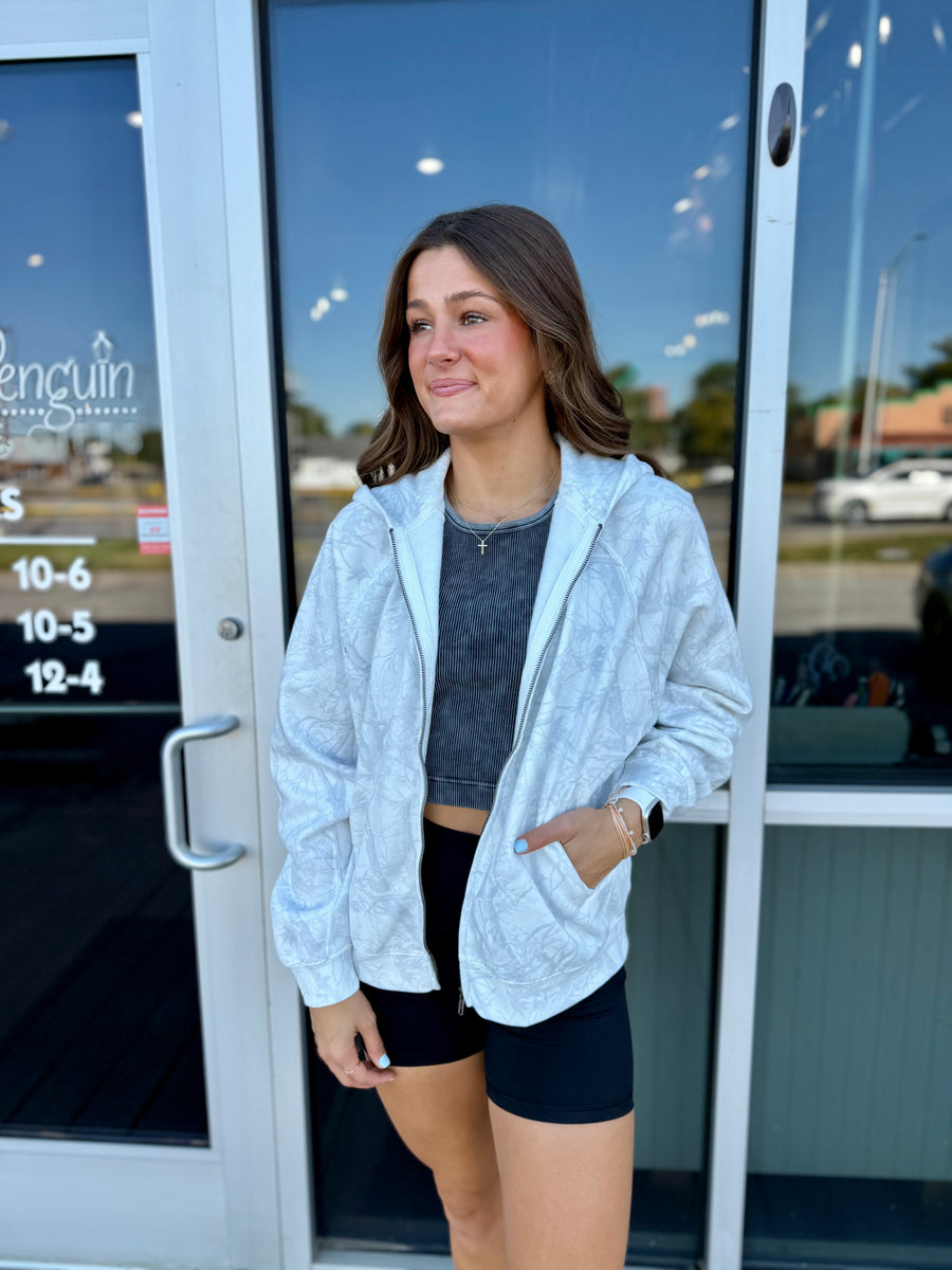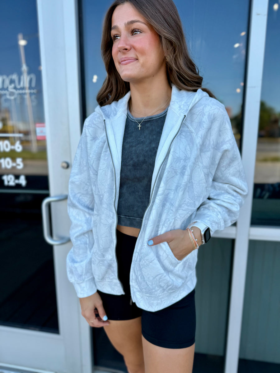 Stay warm and stylish with our Ivory Camo Zip Up Hoodie. The relaxed, super soft fit will keep you comfortable while the trendy camo design adds a touch of fashion to your wardrobe. Zip up and stay cozy this season.