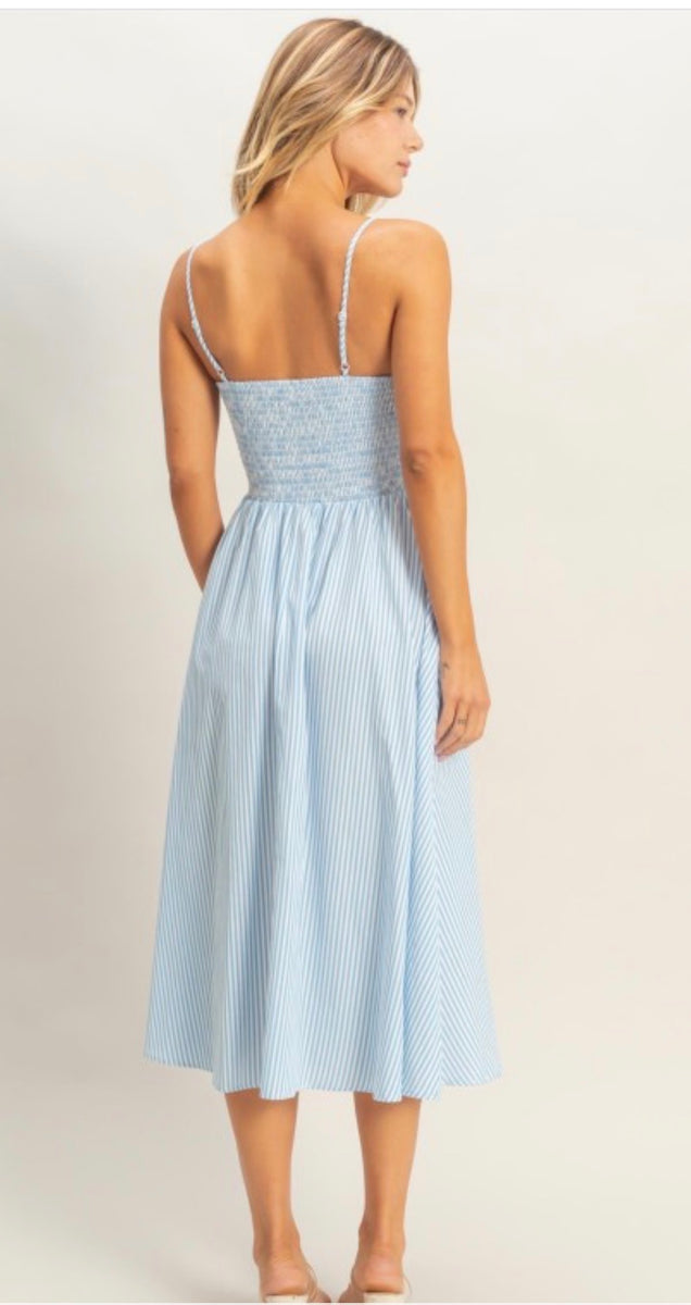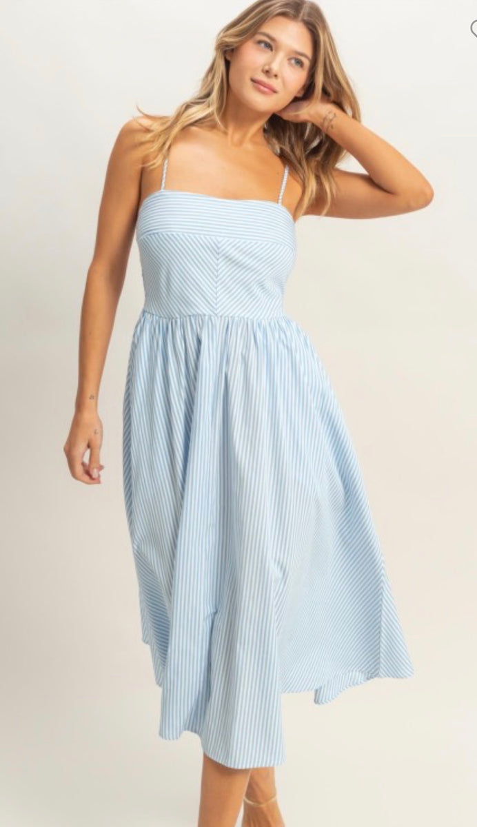 The A291 is a stylish blue stripe midi dress featuring adjustable straps for a comfortable fit. Its versatile design makes it perfect for casual outings or dressier occasions, allowing you to express your style effortlessly. Enjoy the ease of movement and a flattering silhouette with this essential wardrobe piece.