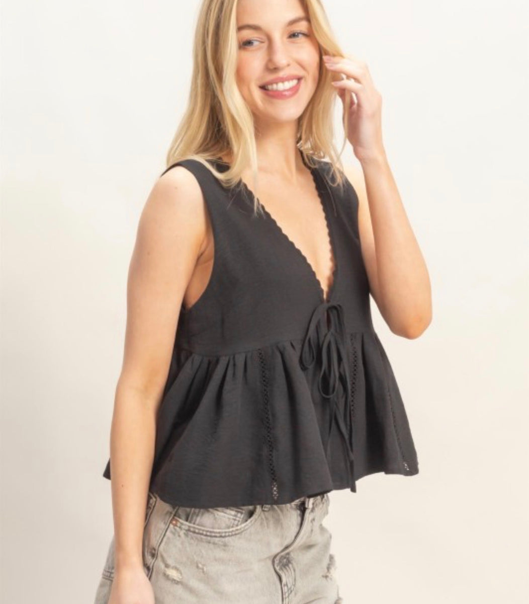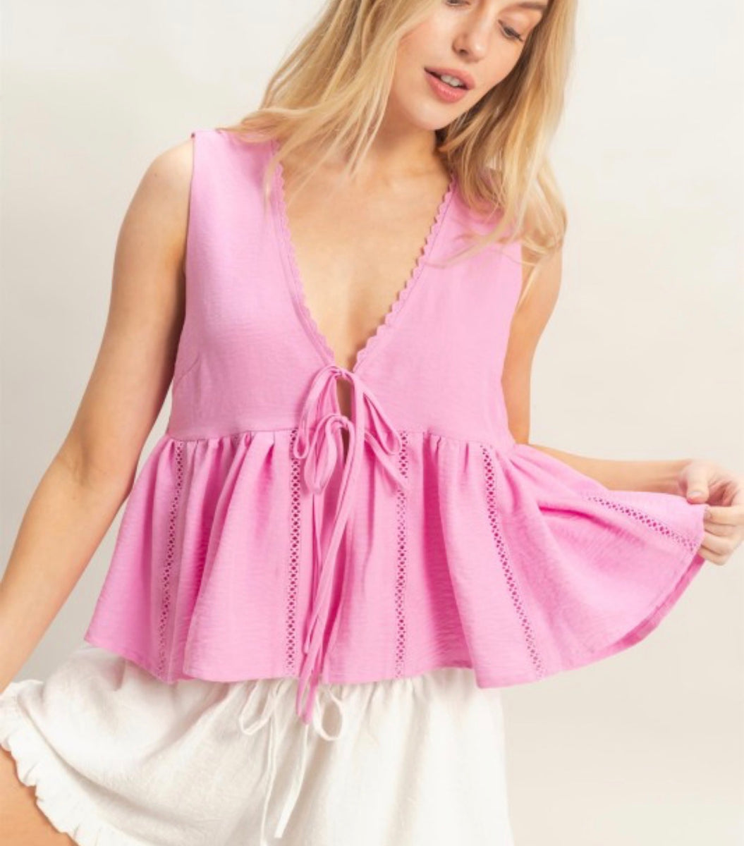The C100 features a stylish front tie design available in black or pink. This versatile top adds a touch of flair to any outfit, making it perfect for both casual and dressed-up occasions.