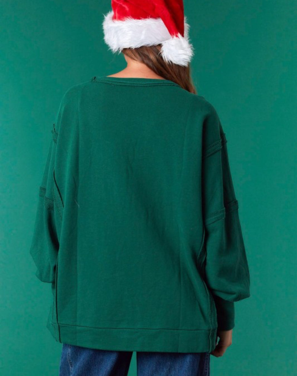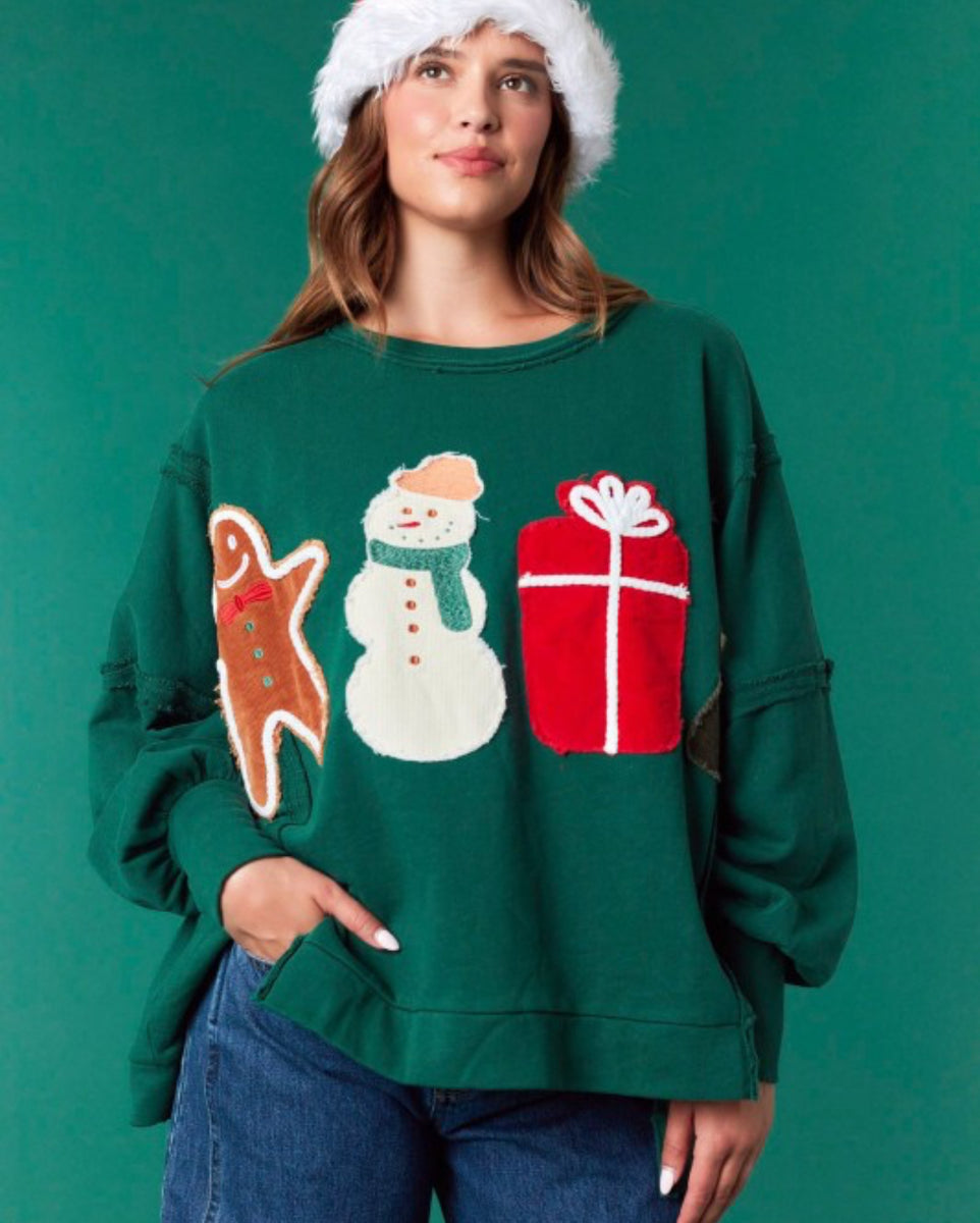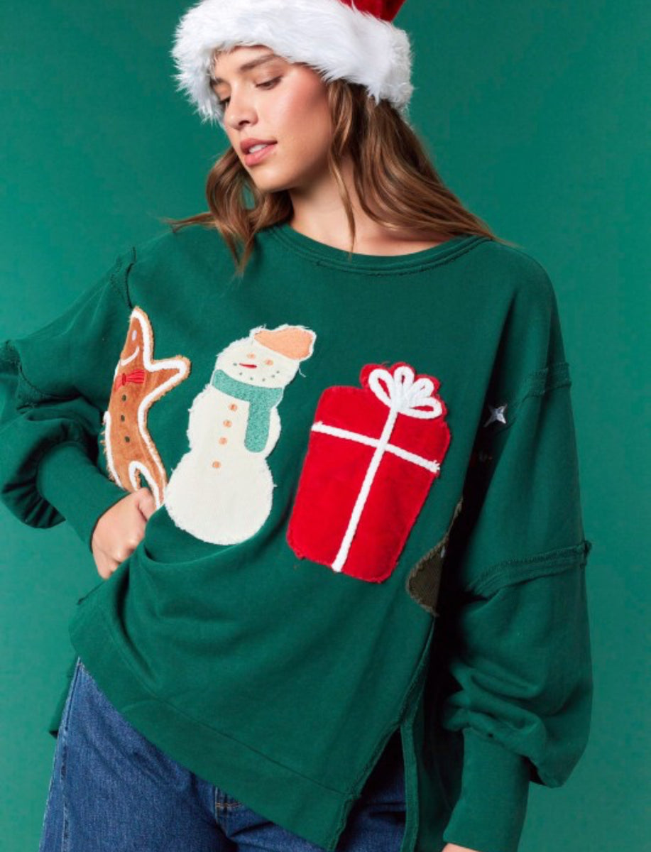 Stay cozy and festive this holiday season with our green oversized pullover adorned with charming Christmas patches. Perfect for lounging or a casual winter outing, this sweater adds a touch of Christmas cheer to any outfit. A must-have addition to your winter wardrobe.