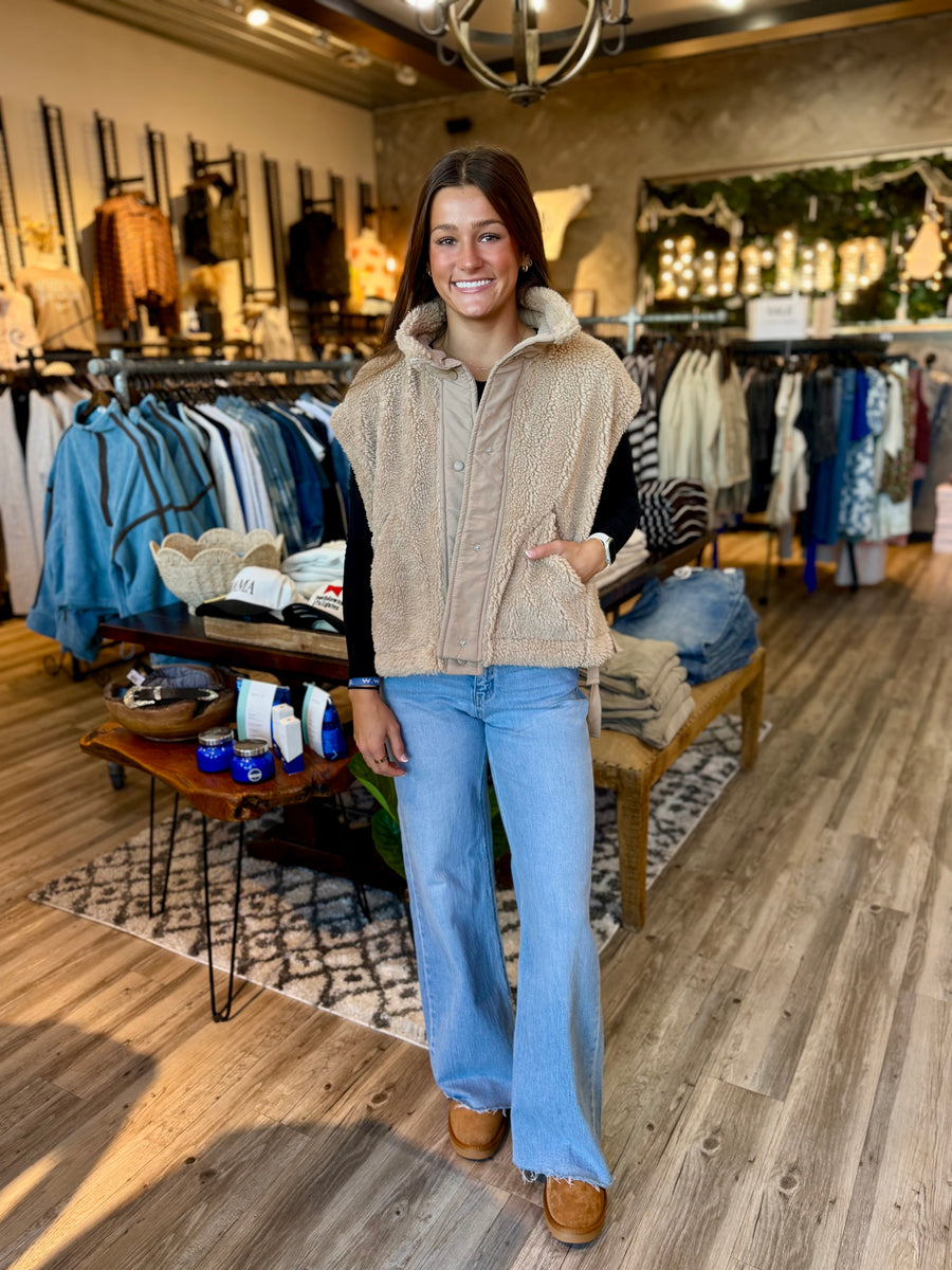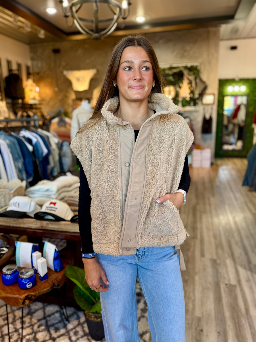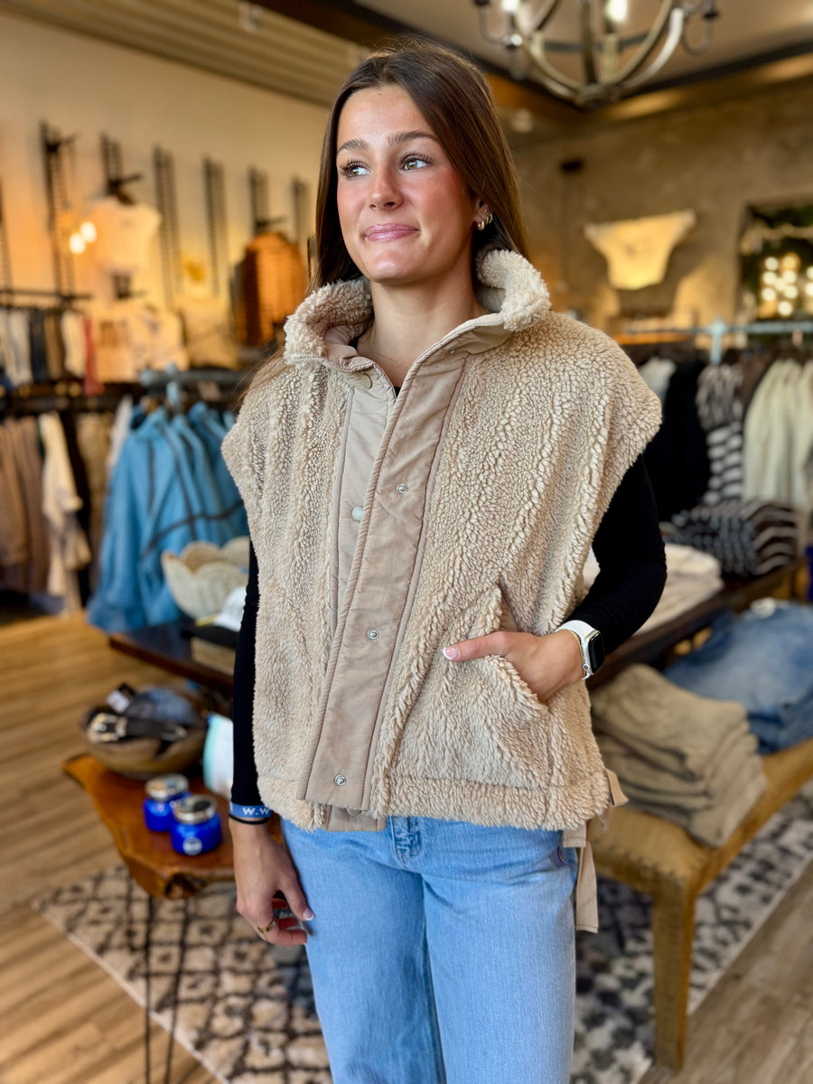 Stay warm and stylish in our versatile F356 vest, available in black, brown, or tan with a cozy Sherpa lining. Perfect for layering, the side ties add a touch of flair to this oversized vest.