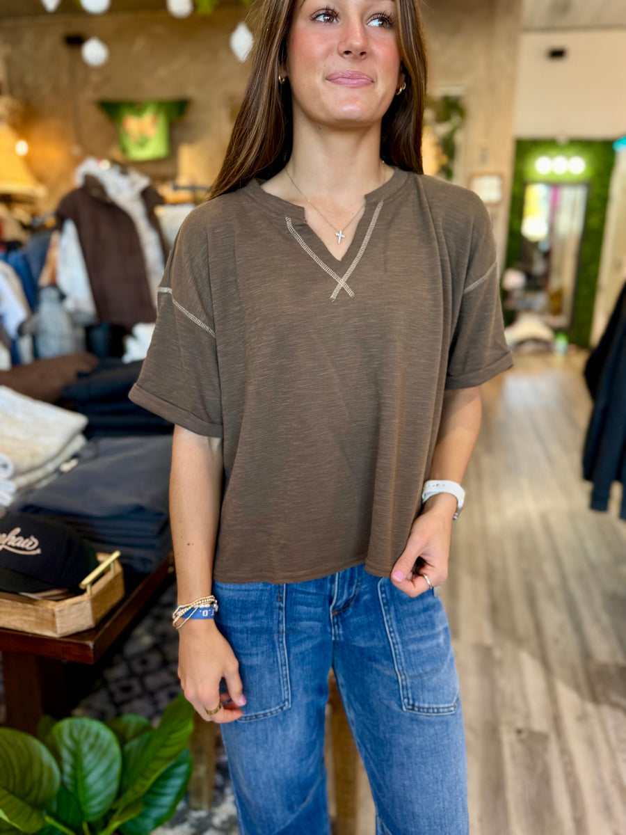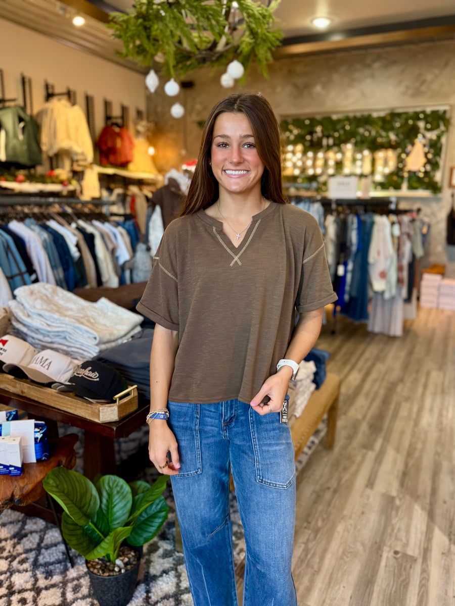 This brown short sleeve tee is designed with a relaxed fit for maximum comfort. Perfect for everyday wear, this tee is versatile and easy to style. Model seen in size small.