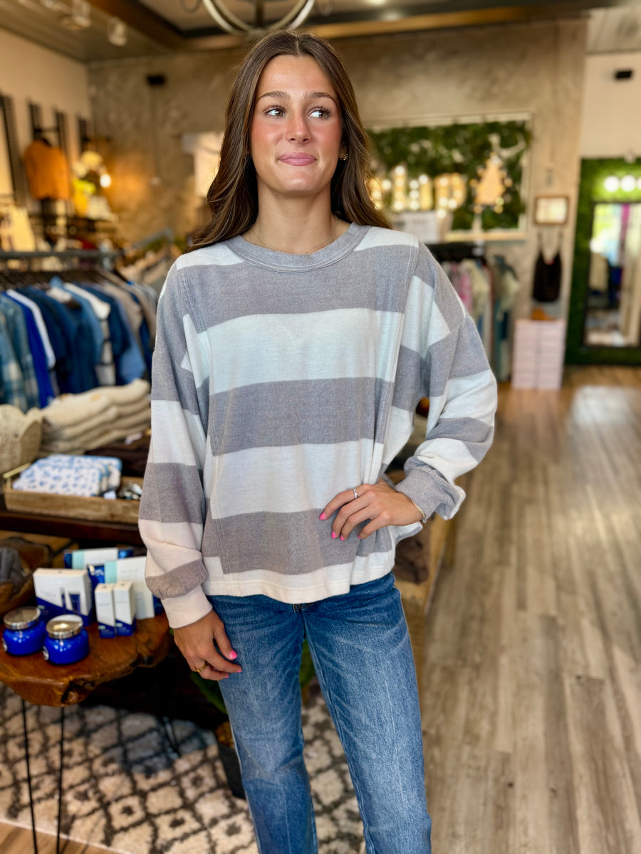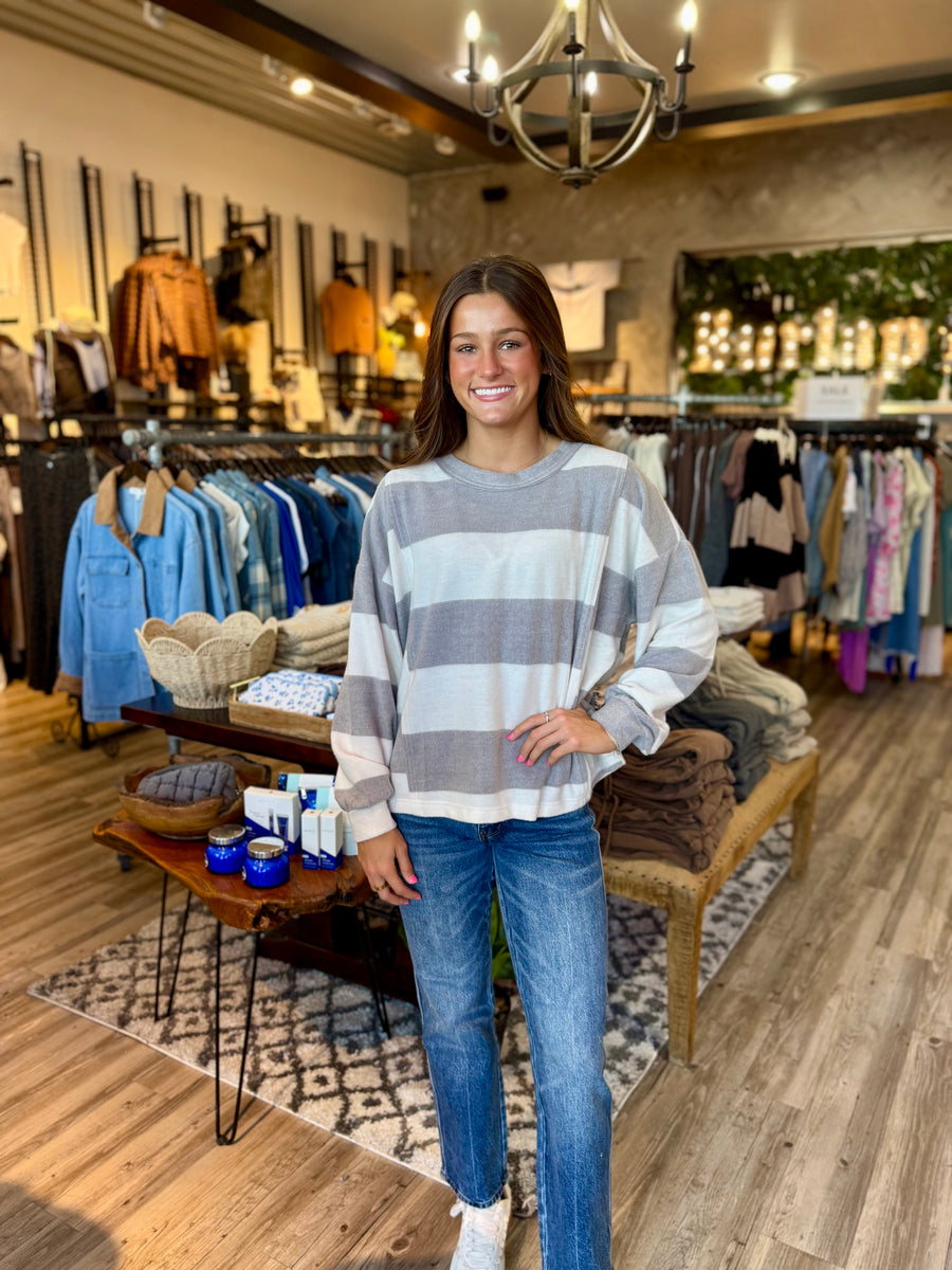Effortlessly stylish and comfortable, the Ft1015 pullover boasts a relaxed fit and is crafted with a super soft fabric in a trendy taupe and ivory wide stripe design. Perfect for a casual yet chic look.