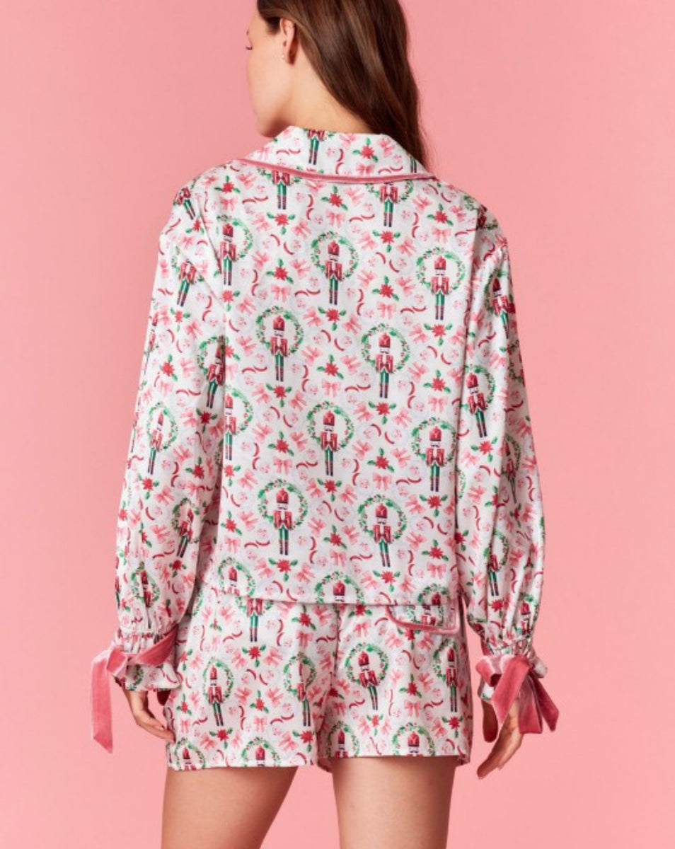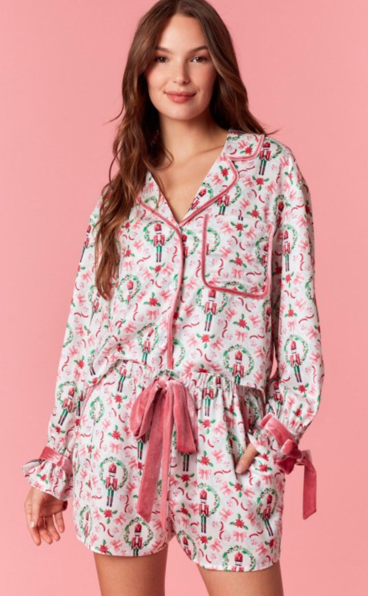 Dress your little one in our satin toy solider pink and ivory pj set. Long sleeve button down top with matching shorts for a comfortable, stylish look. Perfect for a cozy night's sleep or lounging around.
