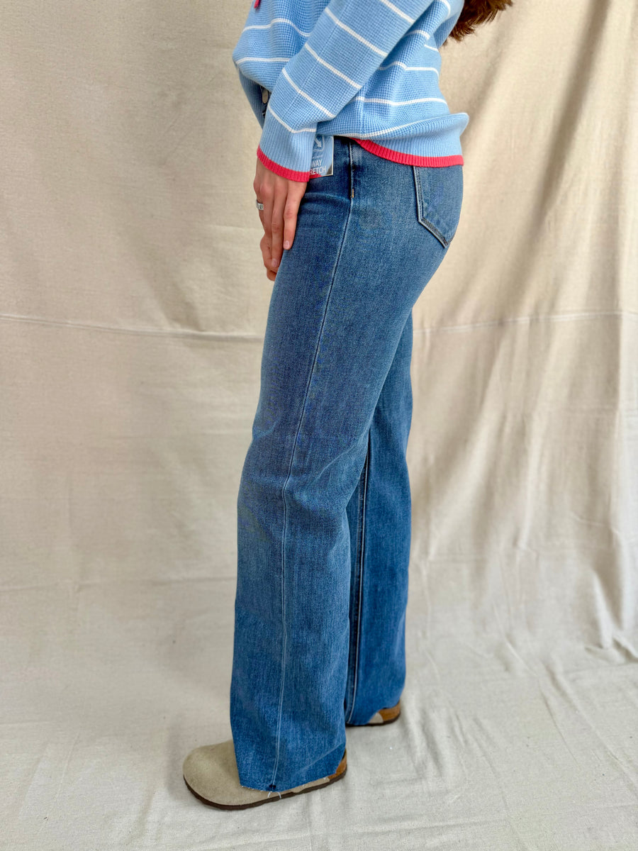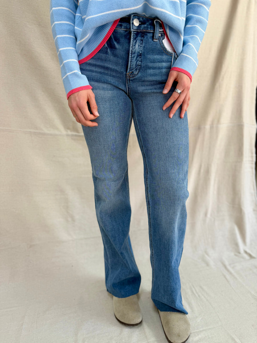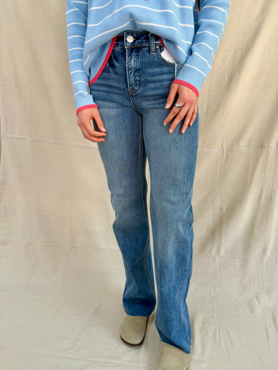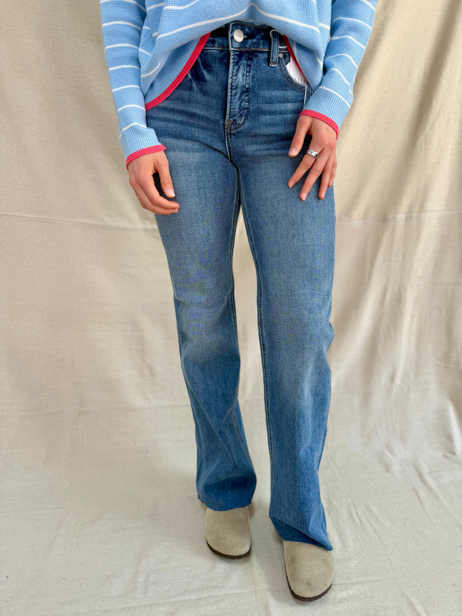 Experience comfort and style with the Risen dark tummy control jeans. Featuring a mid-rise design and 4-way stretch, these jeans provide a flattering fit and ease of movement. The 9 1/2” rise and 32 1/2” inseam ensure a sleek silhouette for any occasion.