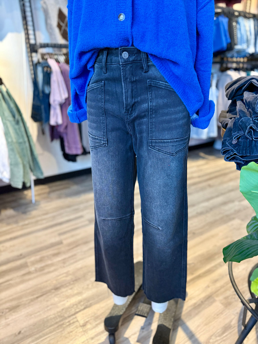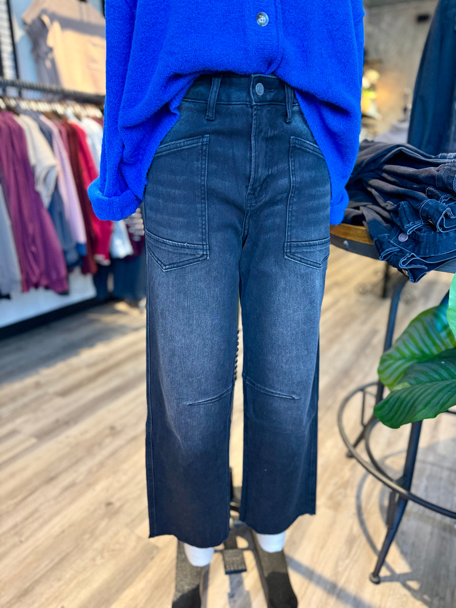 Elevate your style with the Vervet by Flying Monkey High Rise Raw Hem Barrel Jeans. These 3575 black jeans feature an 11" rise and 26 3/4" inseam, offering both comfort and a trendy look. Perfect for any occasion, these jeans will become your new go-to choice.