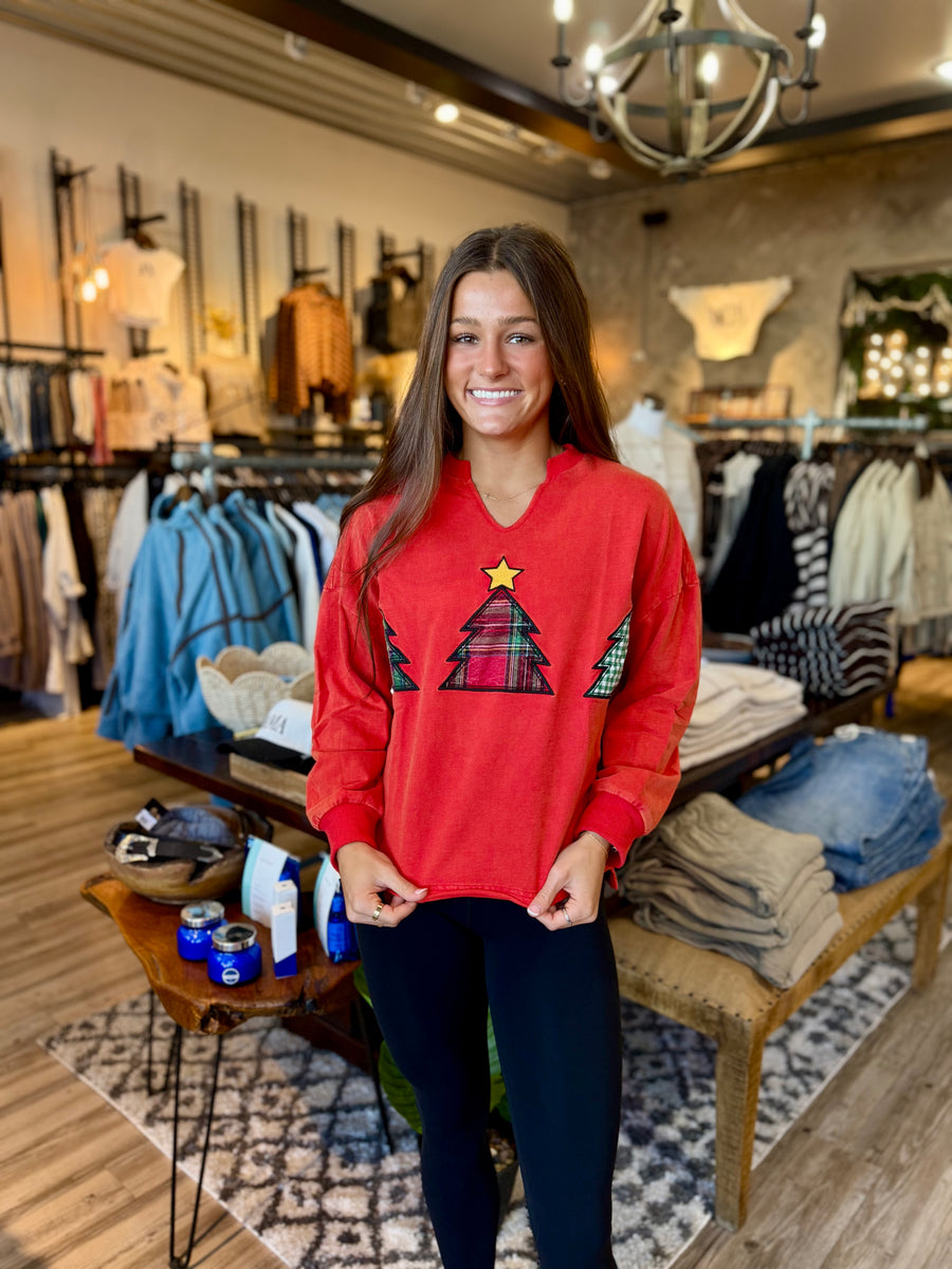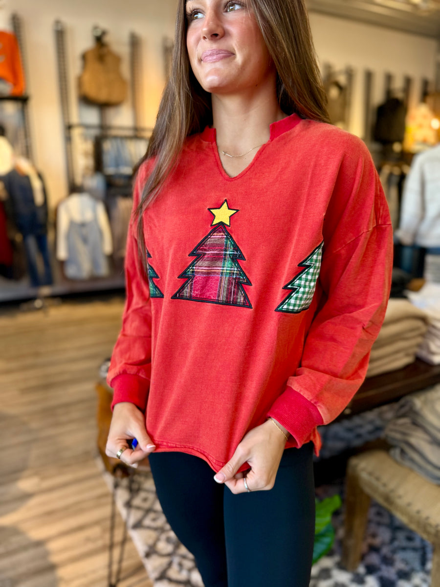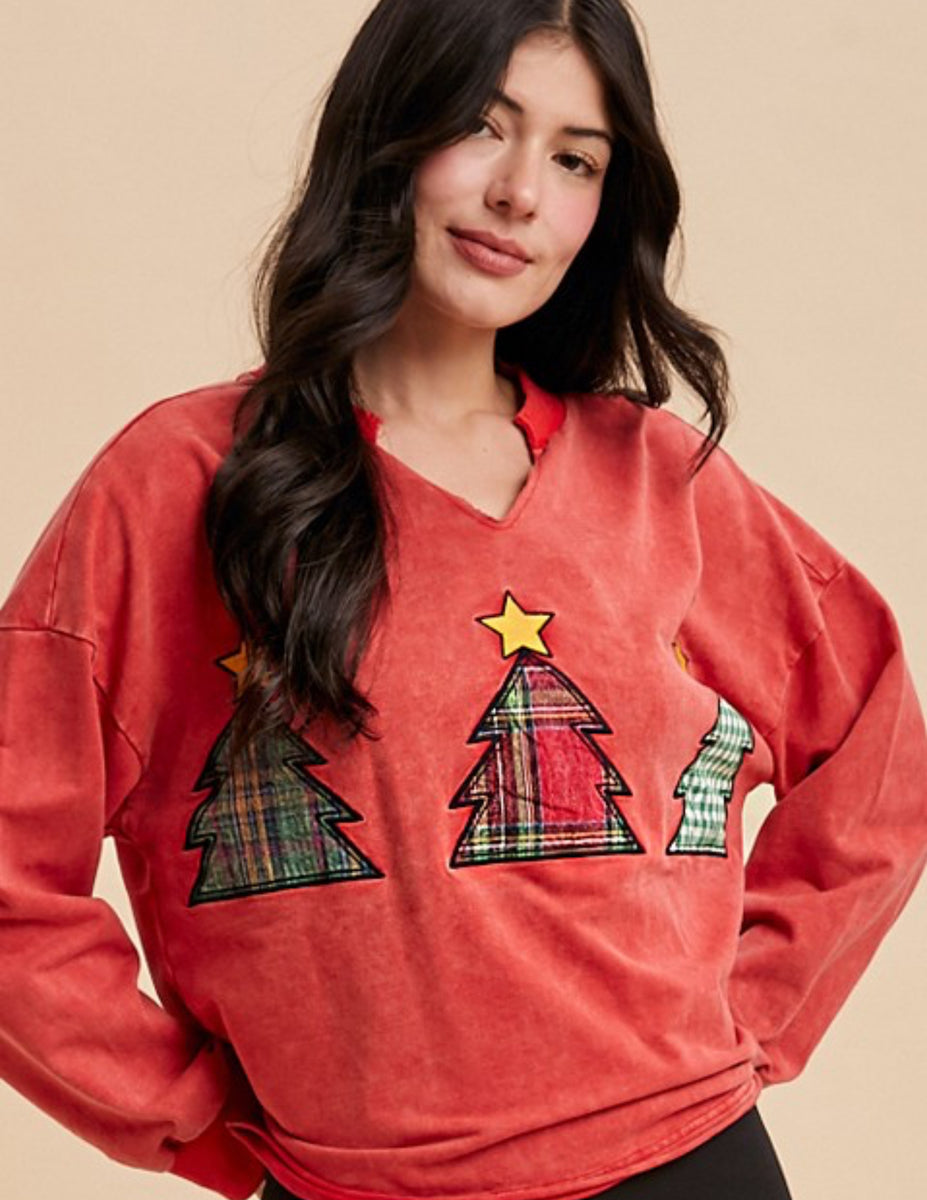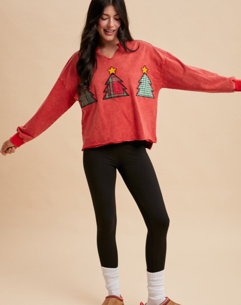 Effortlessly showcase your festive spirit with our versatile 2271c top! The red mineral wash terry fabric adds a unique touch, while the 3 patchwork Christmas tree design brings a playful twist. Whether you're wearing it for the holidays or any day, this top, seen on our model in size small, is sure to make a statement.