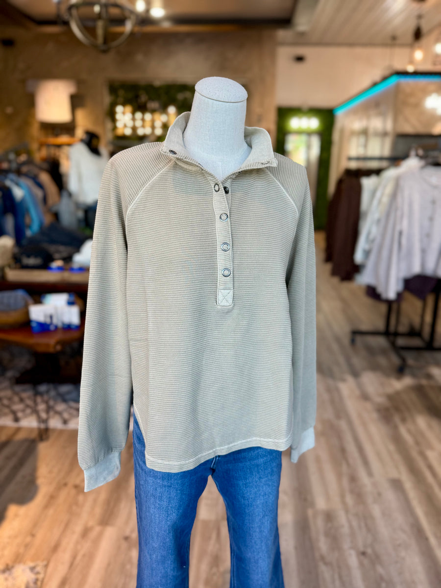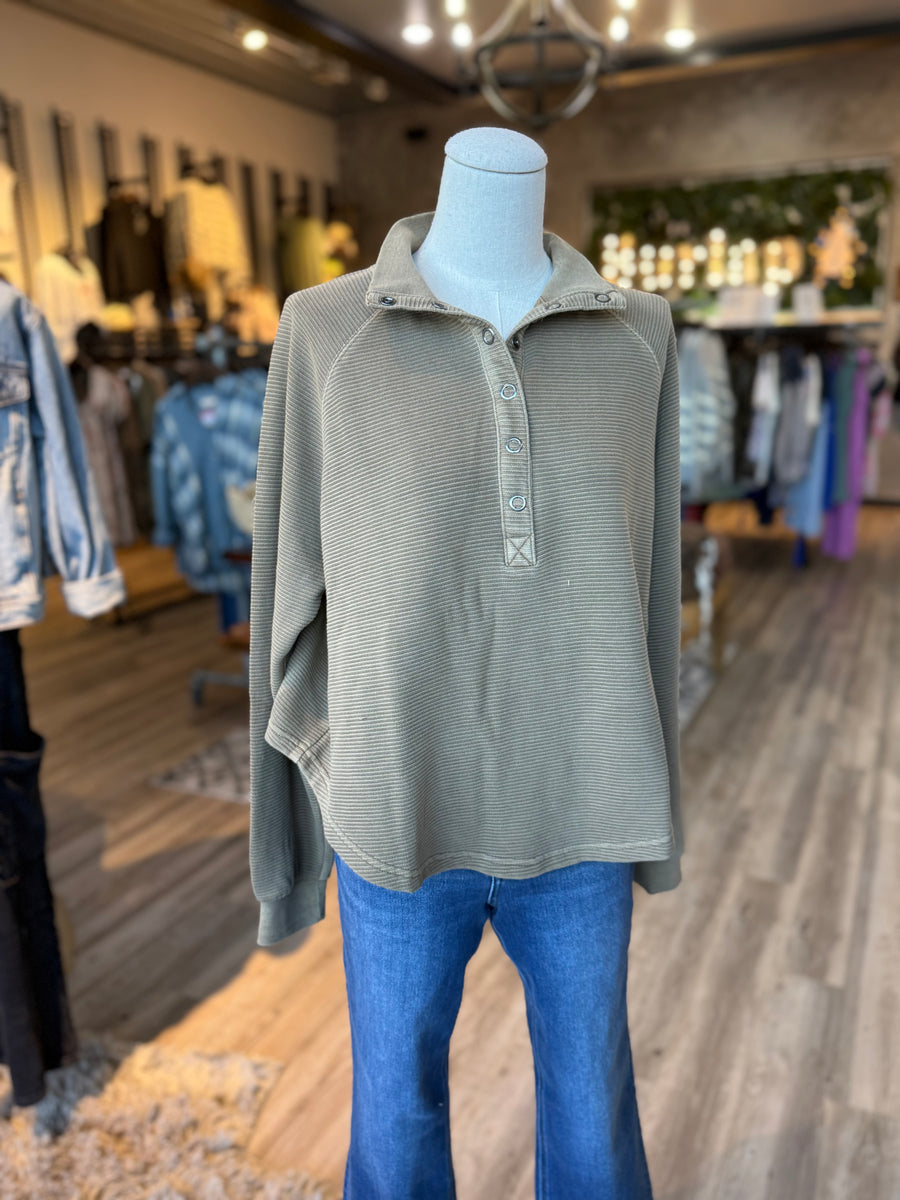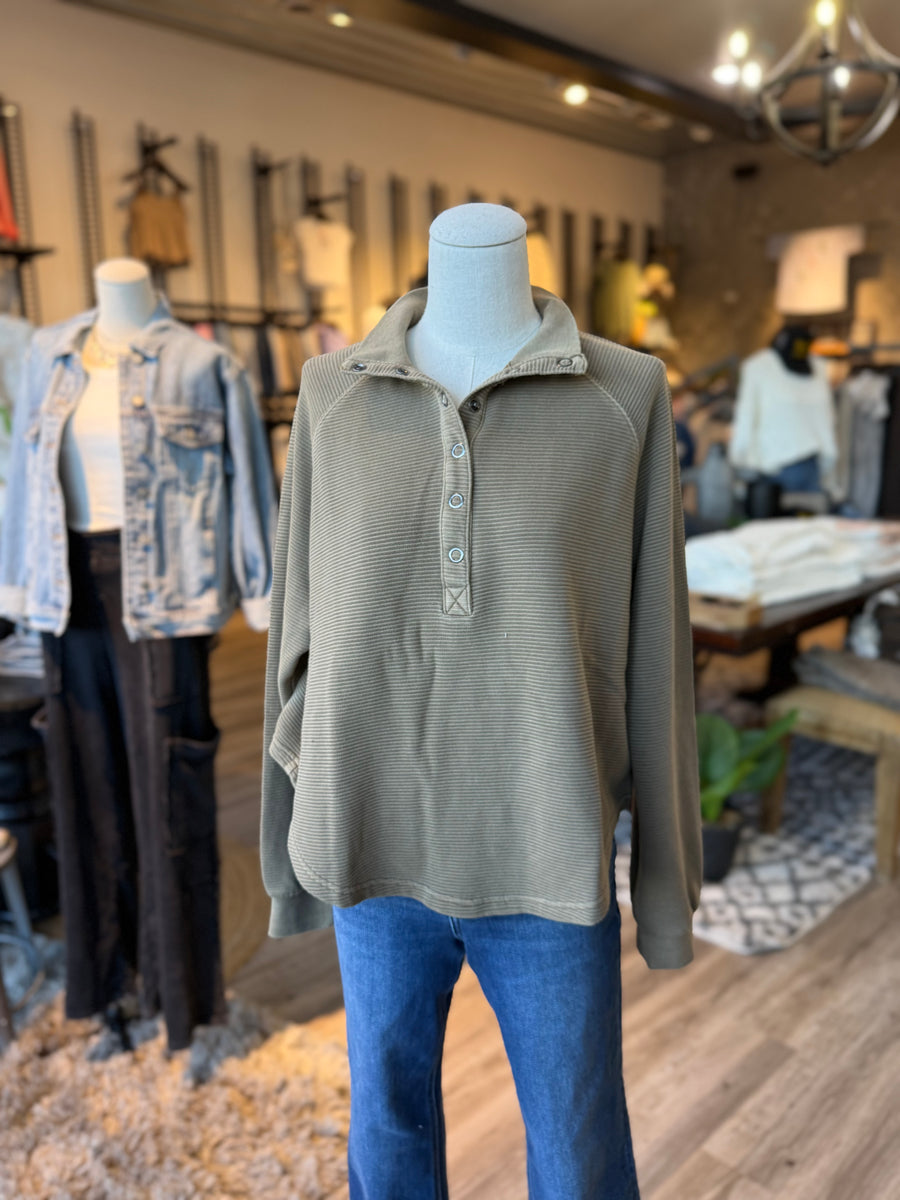 This ribbed Henley pullover offers easy snap buttons and a comfortable fit. A must-have staple for any wardrobe.
