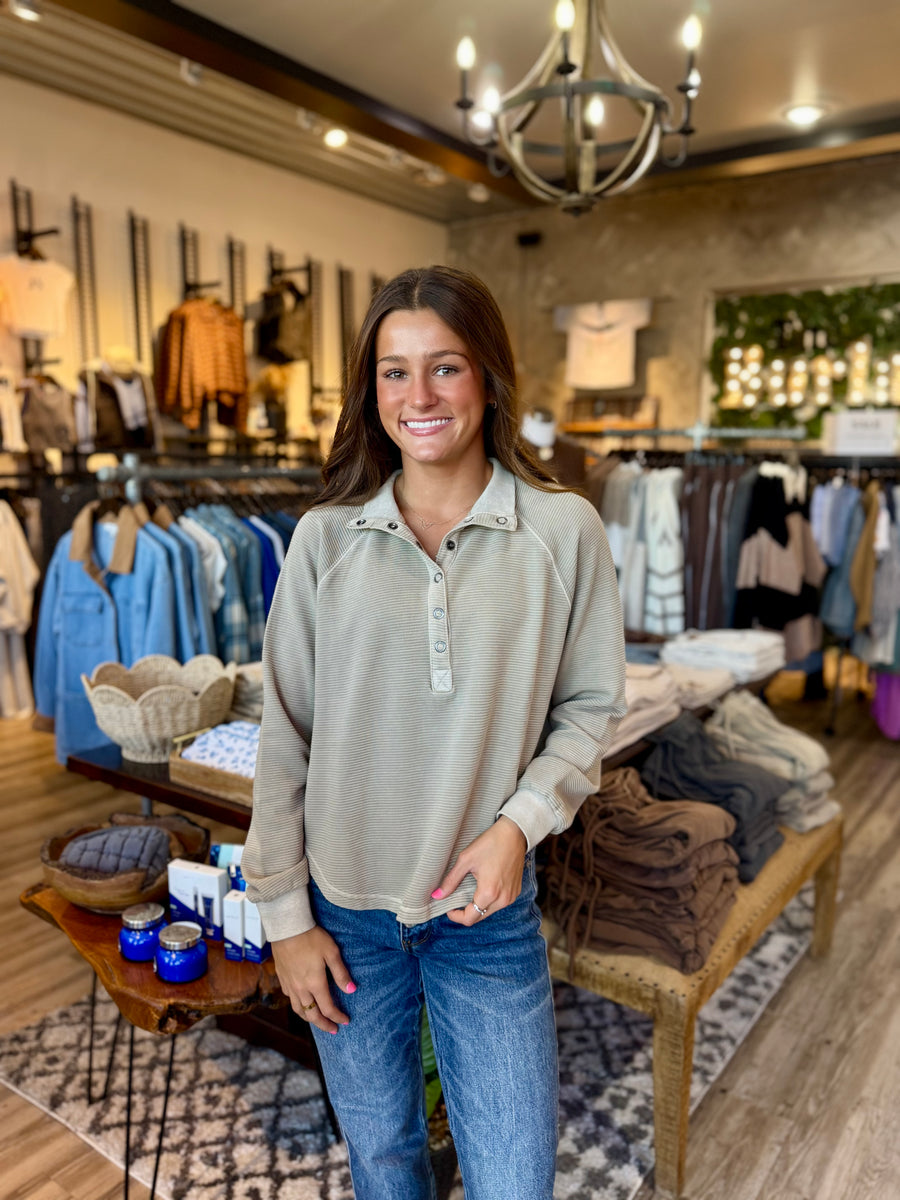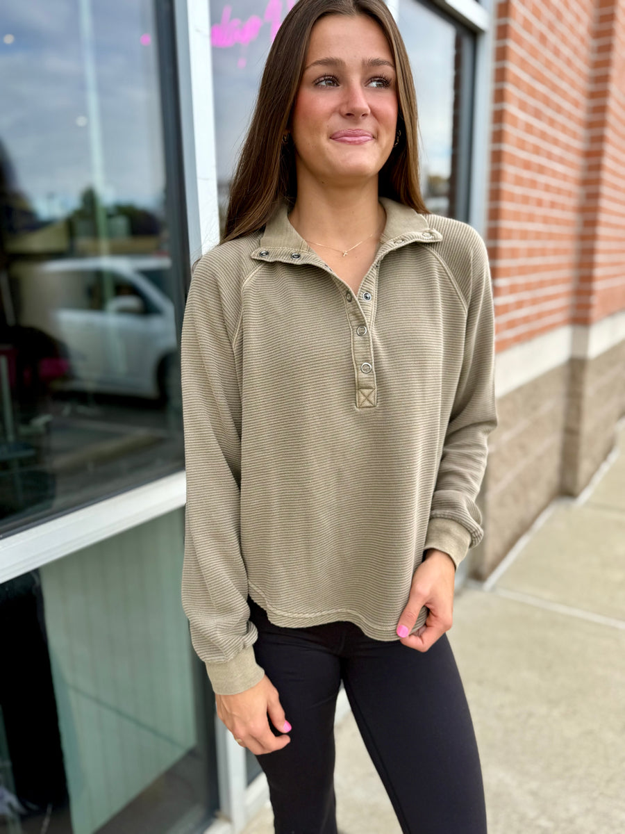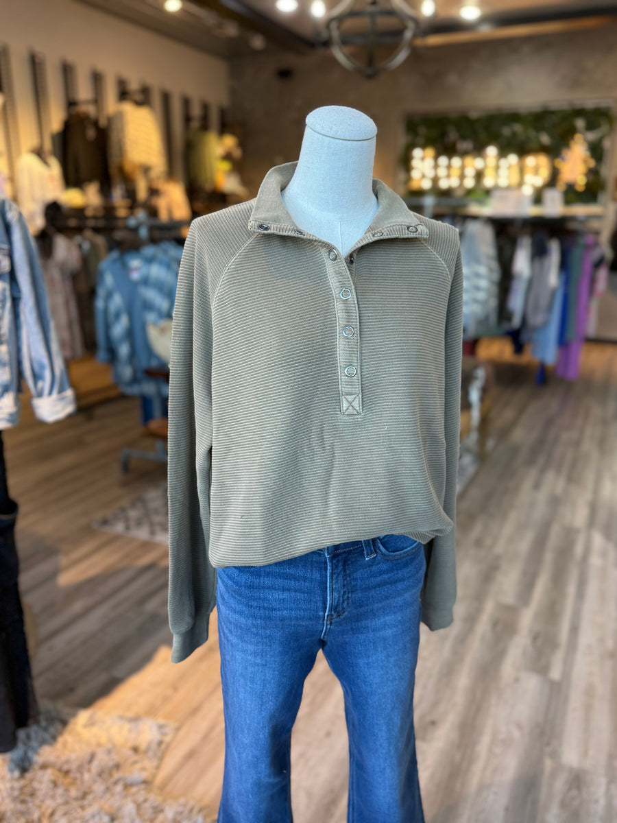 This ribbed Henley pullover offers easy snap buttons and a comfortable fit. A must-have staple for any wardrobe.