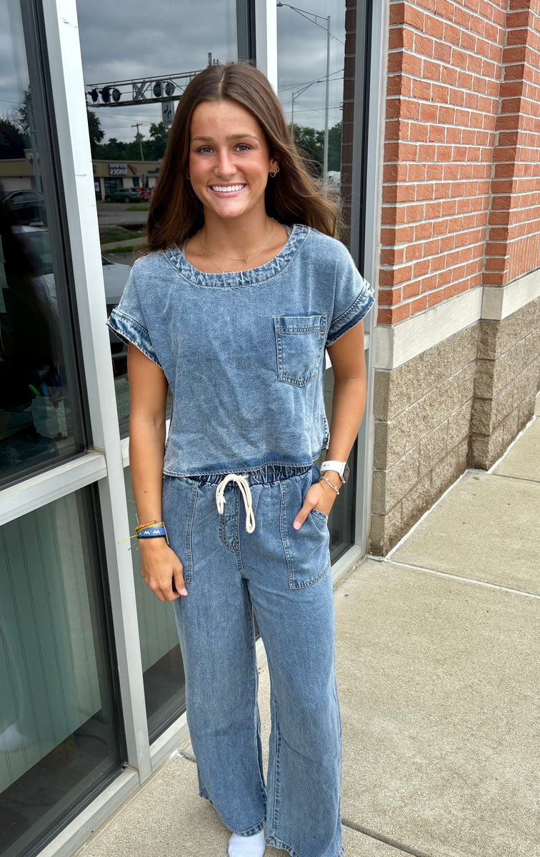 Add some playful style to your wardrobe with our 1032-T top! Made with chambray denim pocket tops, this top pairs perfectly with 1032-b for a complete, stylish look. Don't worry about sizing - this top fits true to size.