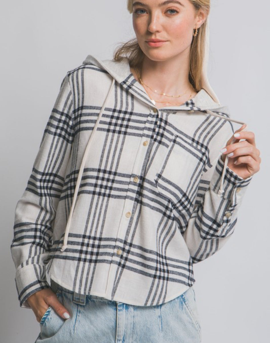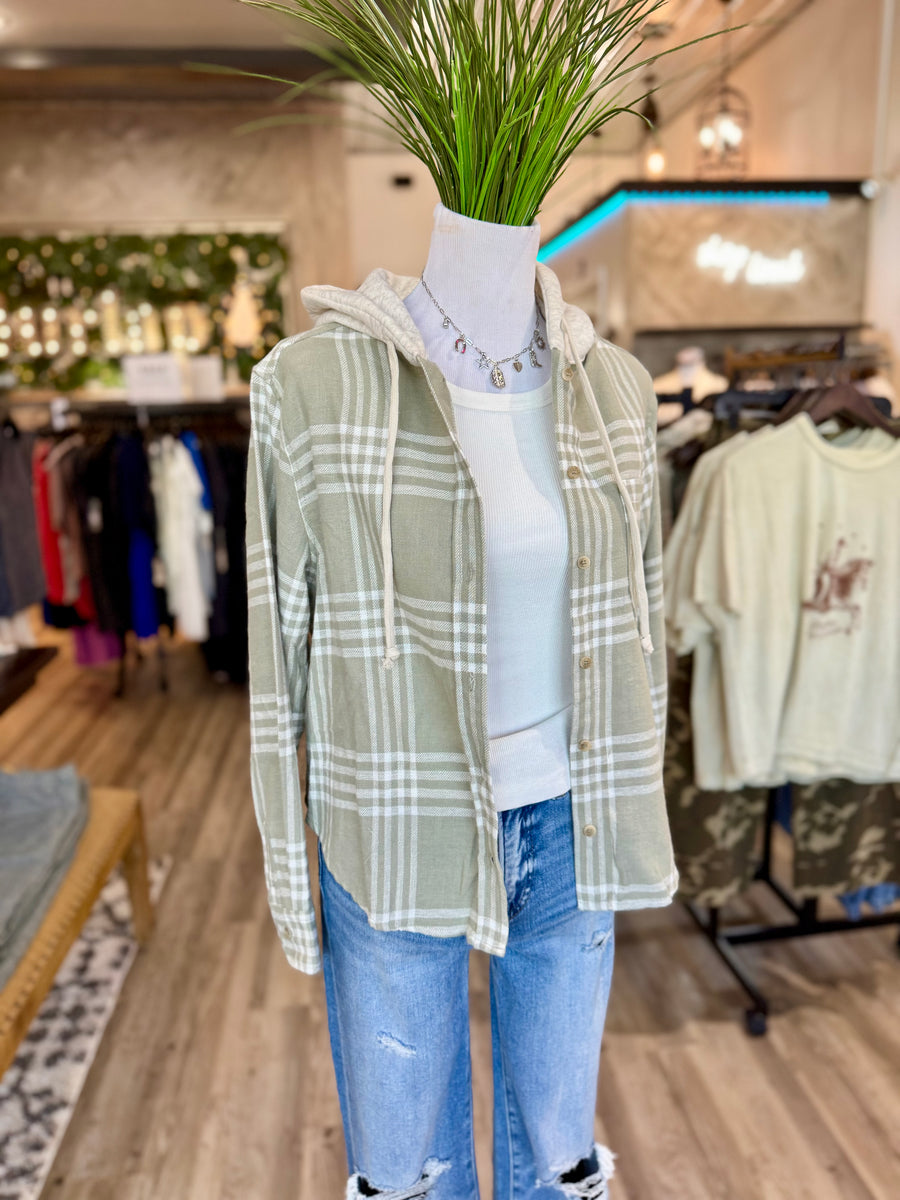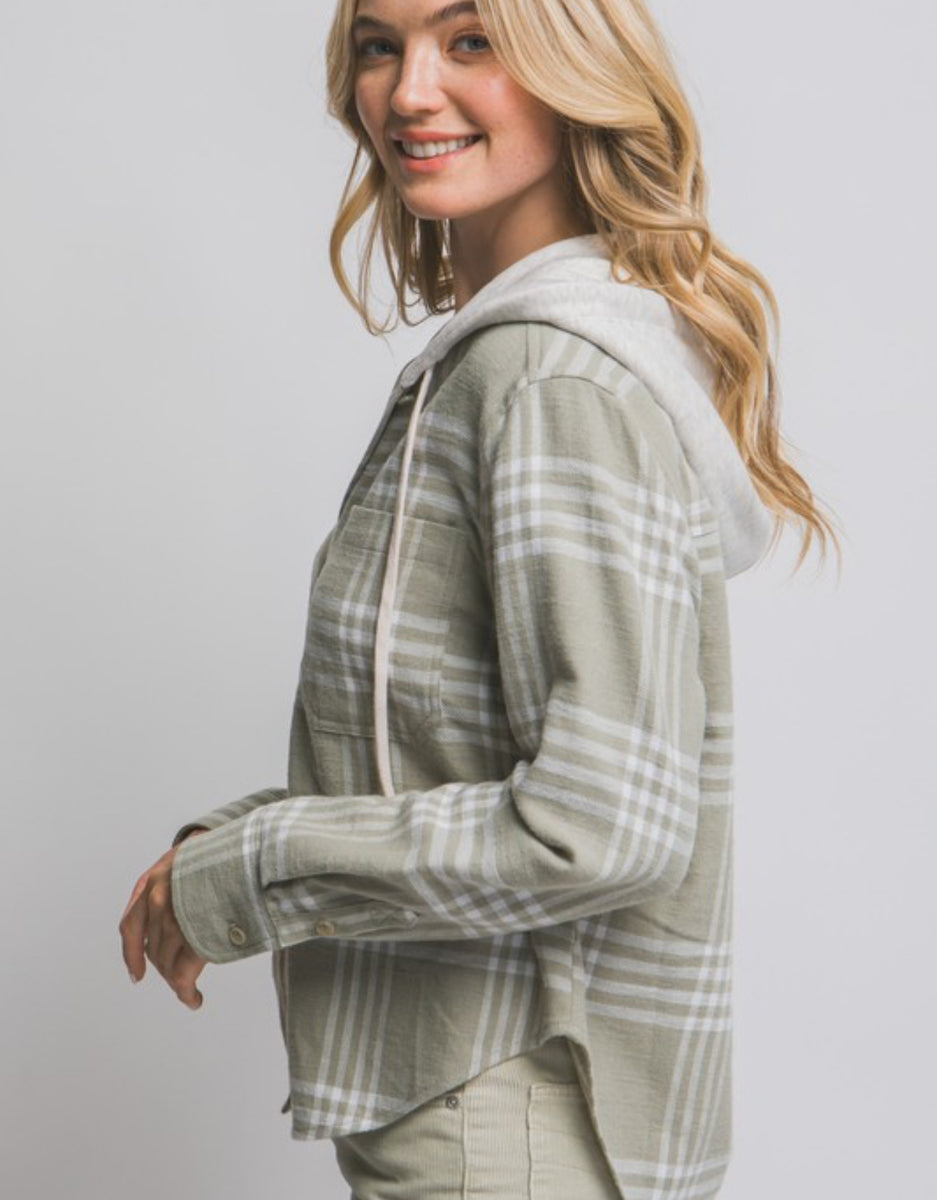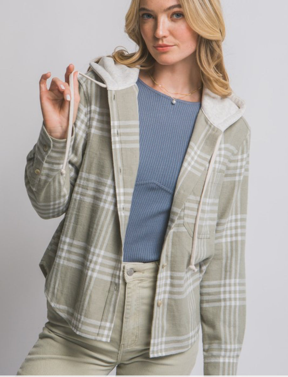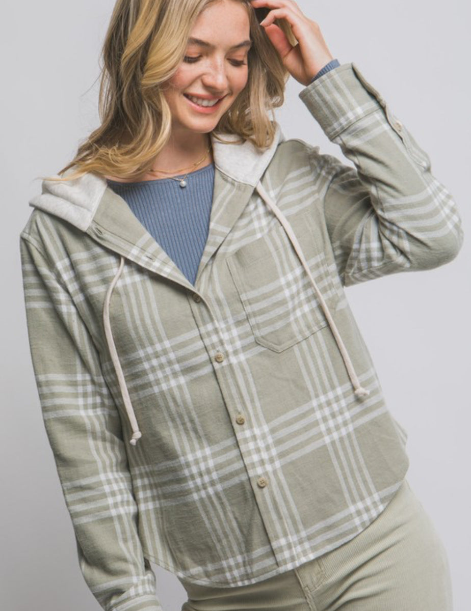 Stay warm and stylish with our 10374 flannel! This hooded button down comes in ivory or olive with a classic plaid pattern. A versatile addition to your wardrobe that pairs well with any outfit.