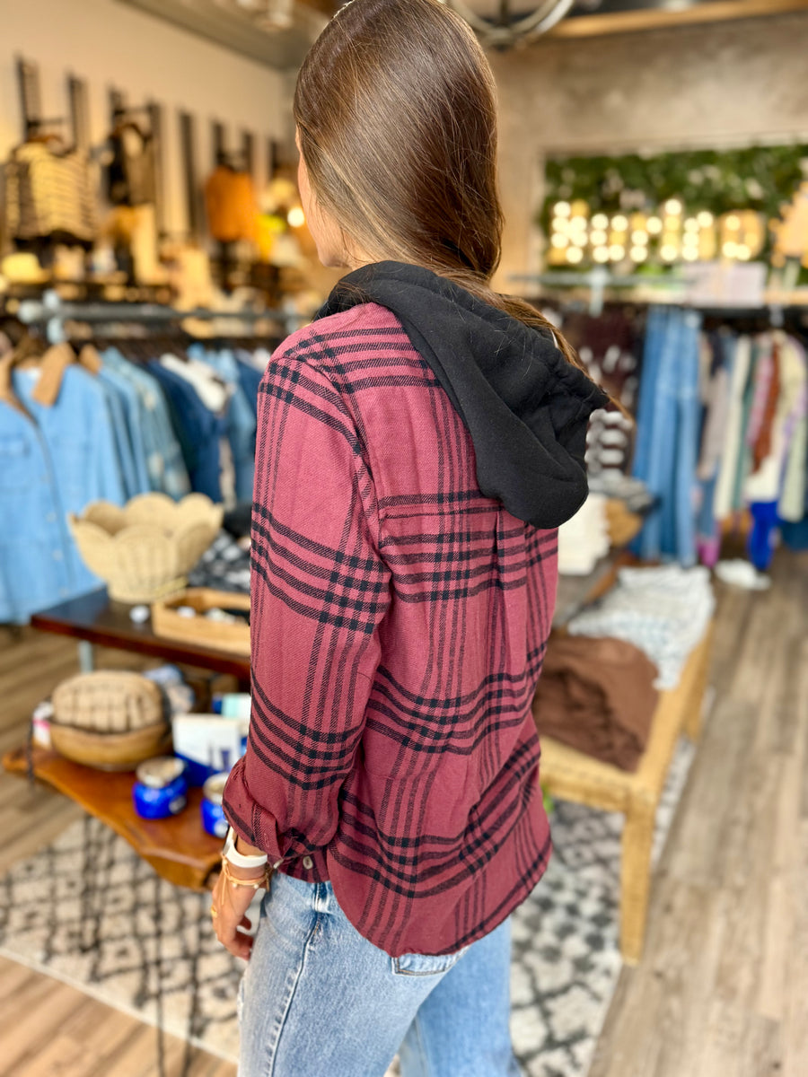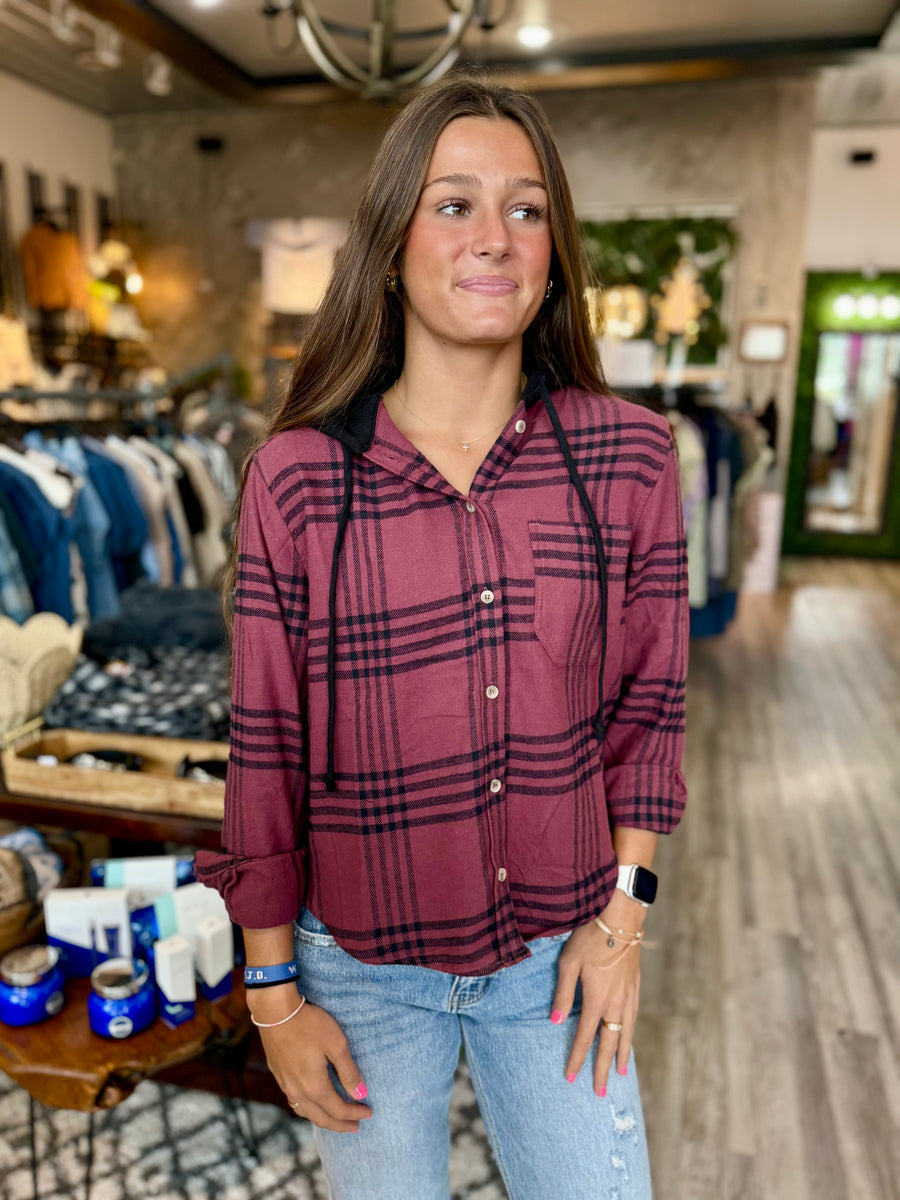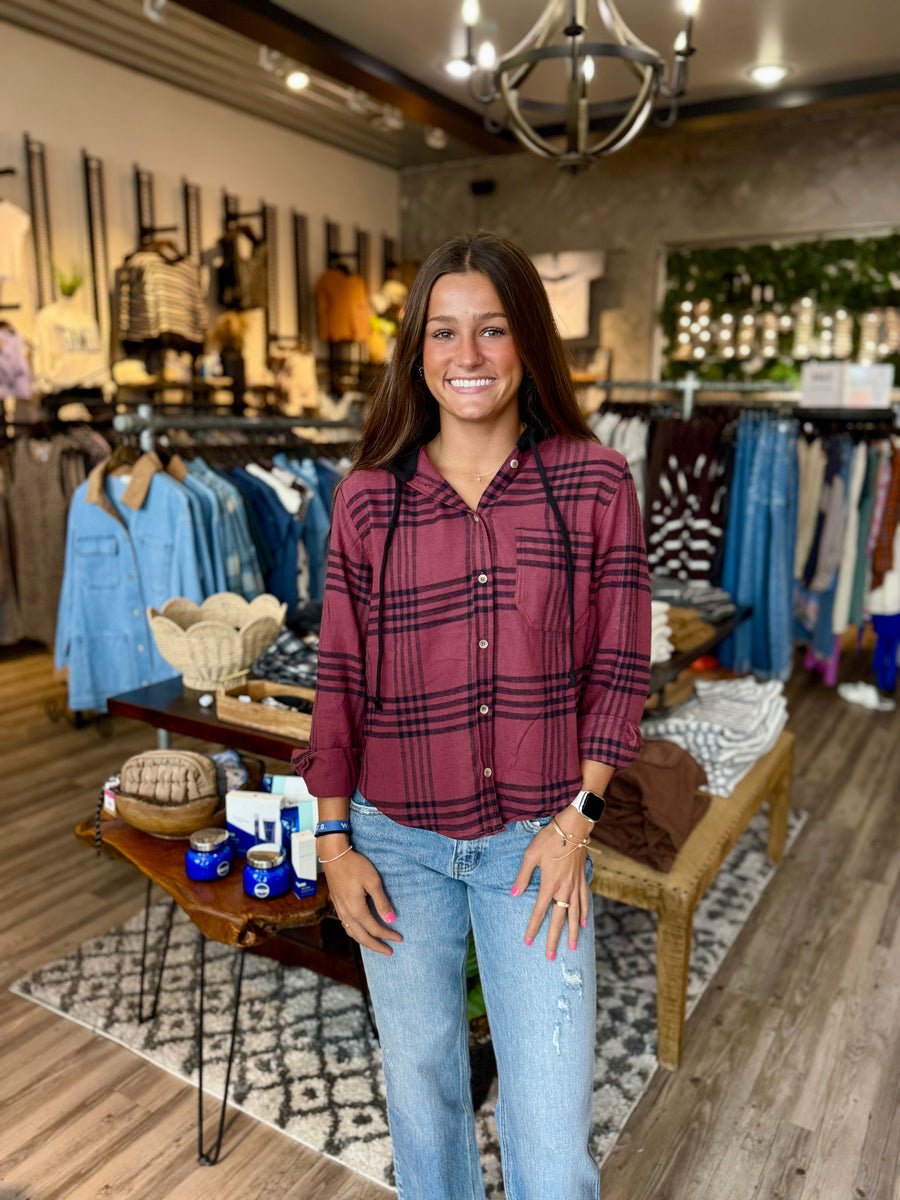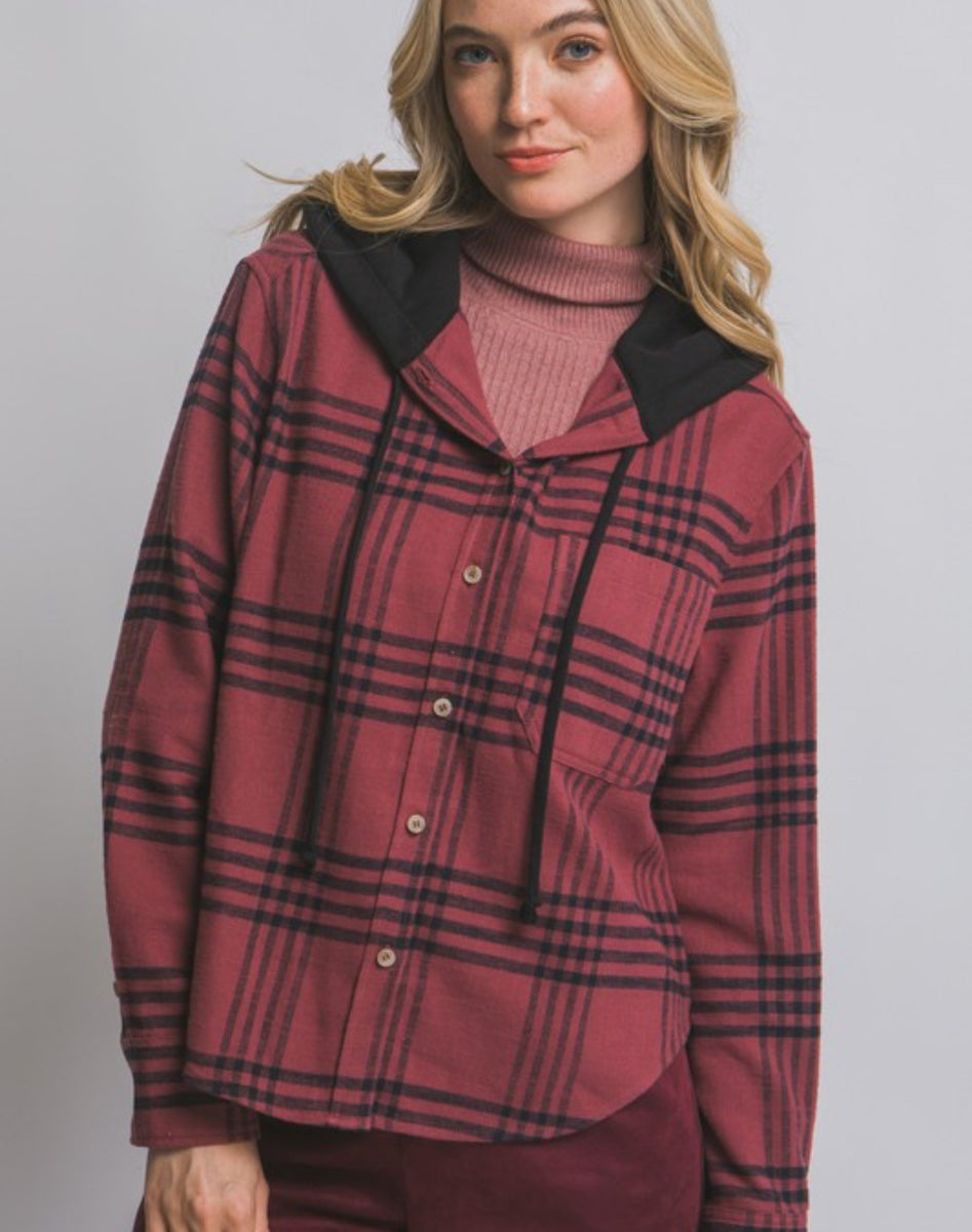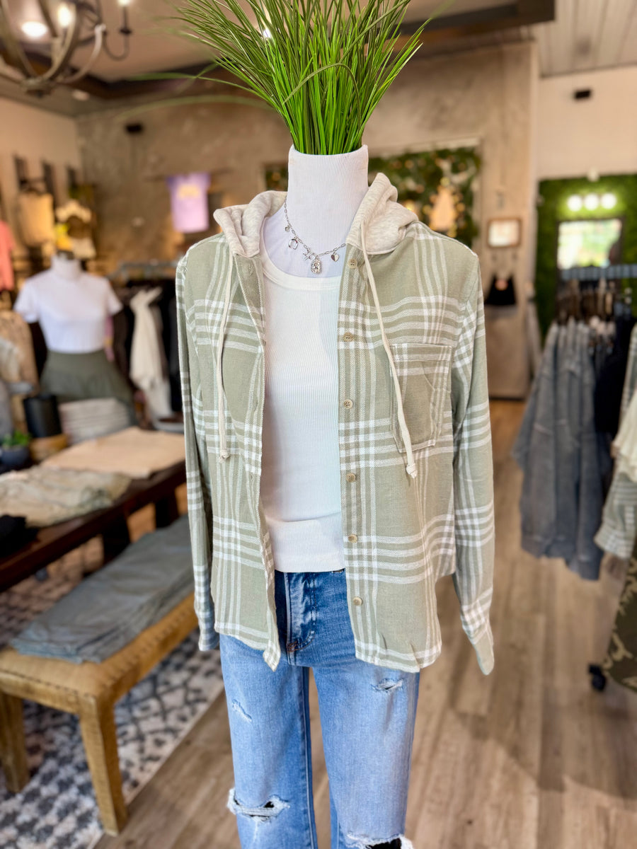 Stay warm and stylish with our 10374 flannel! This hooded button down comes in ivory or olive with a classic plaid pattern. A versatile addition to your wardrobe that pairs well with any outfit.