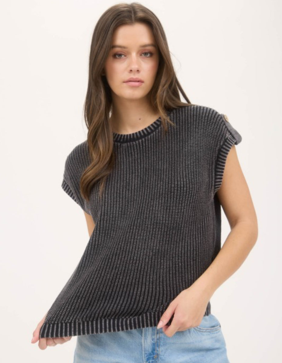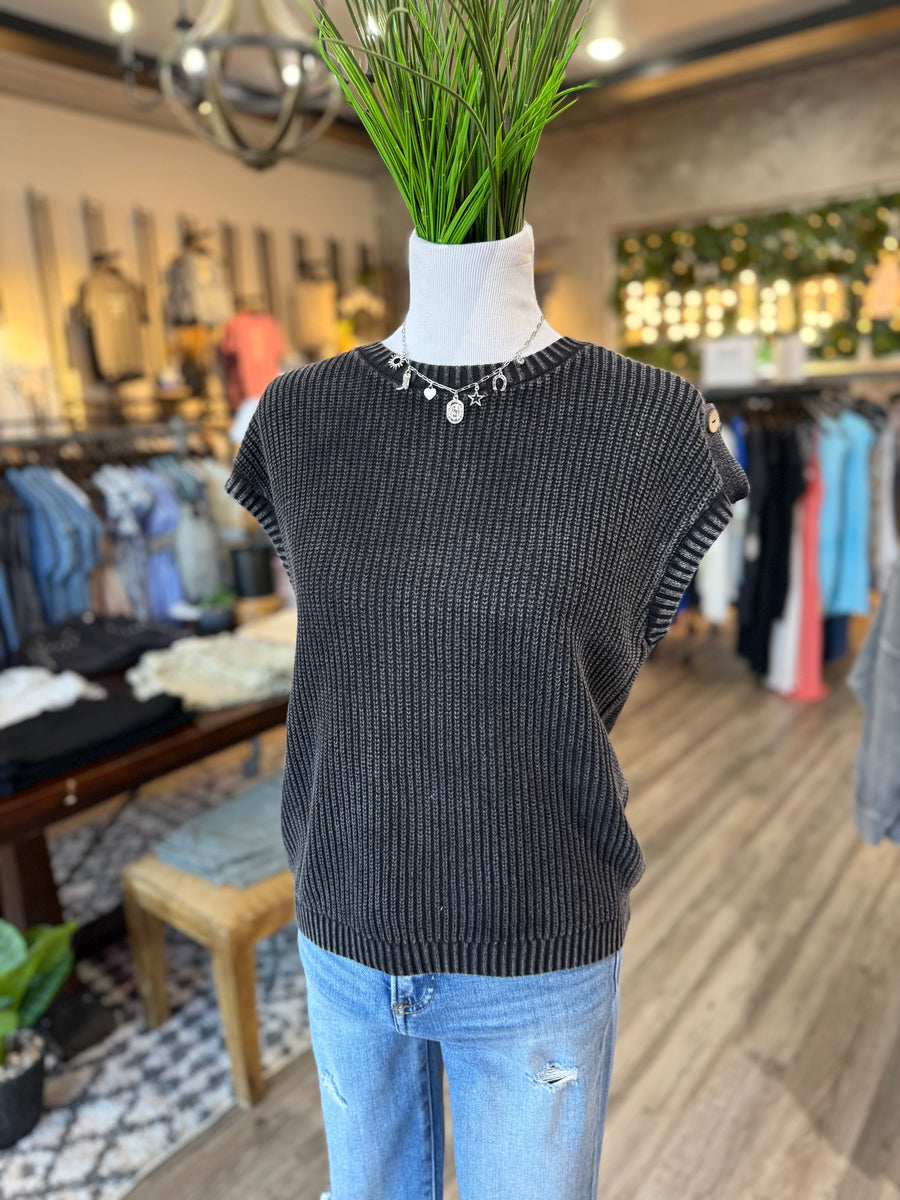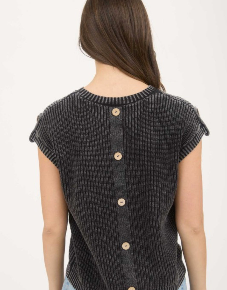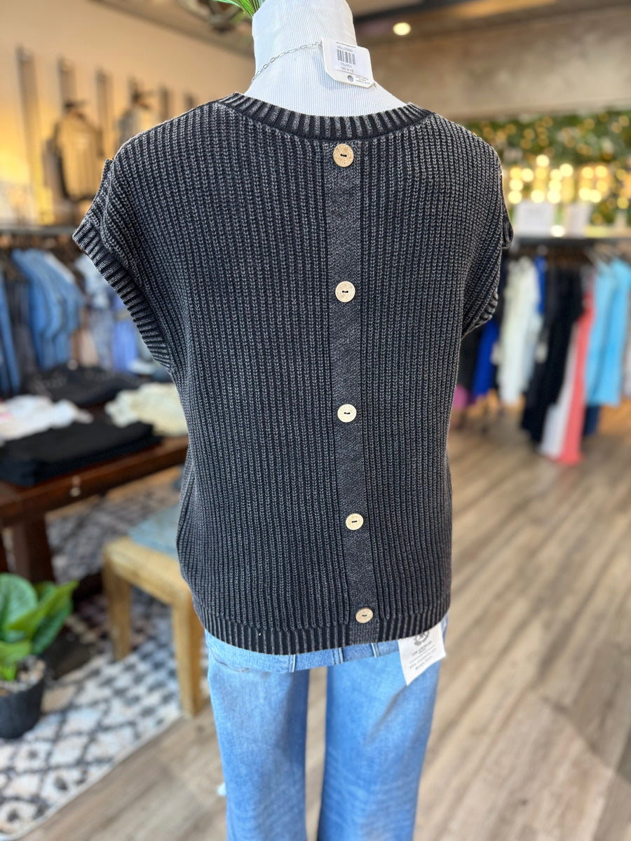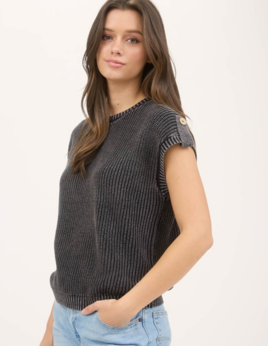 This charcoal washed knit top features short sleeves and a button back design for a versatile and comfortable look. Perfect for everyday wear and easy to dress up or down.