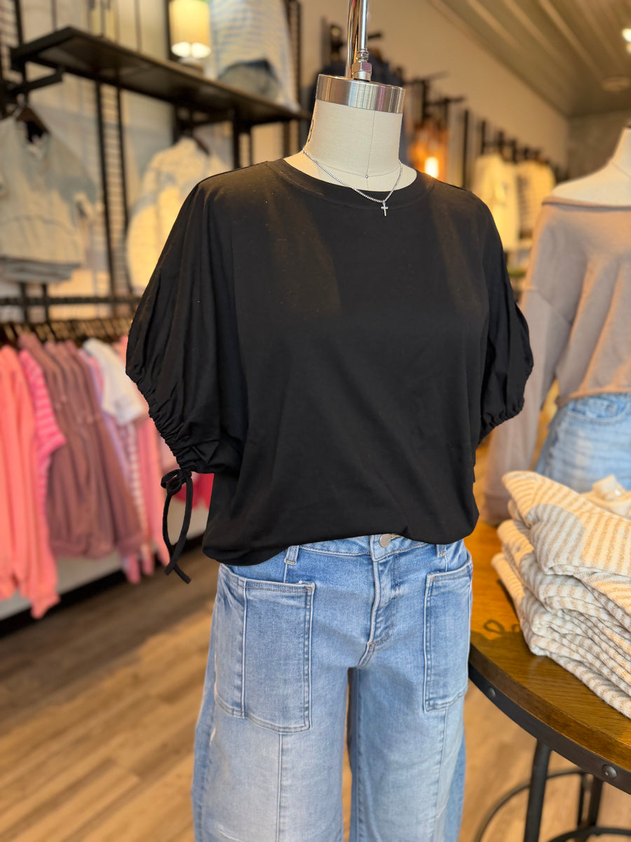 The 11945 black pullover features stylish tie sleeves that add a unique flair to your outfit. Its versatile design makes it suitable for various occasions, providing comfort and a touch of elegance with every wear.