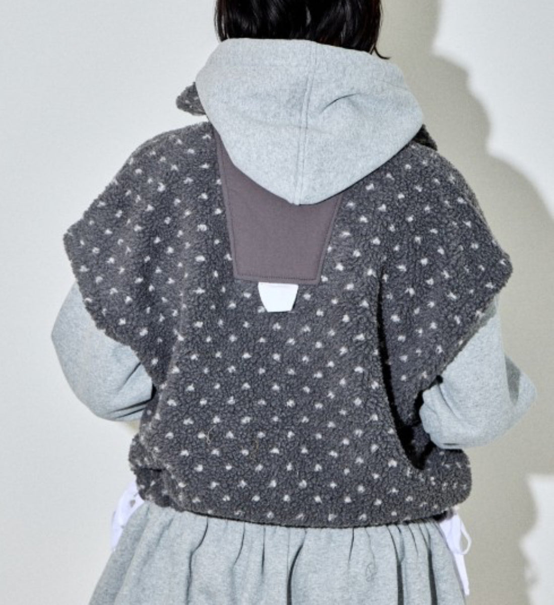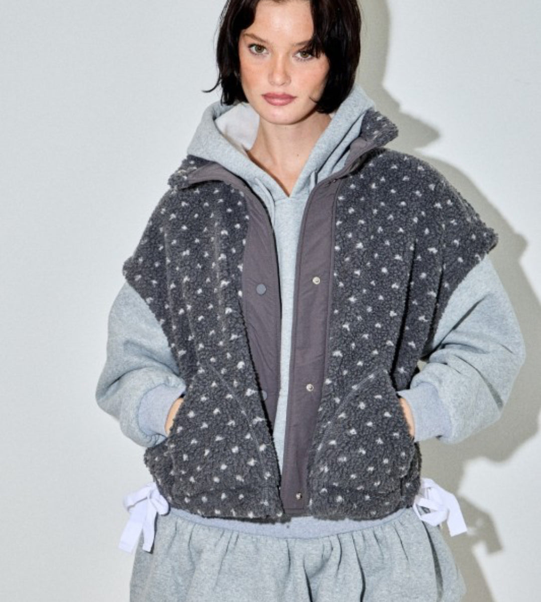 Stay warm and stylish with our Charcoal Gray Sherpa Vest. The relaxed fit and dotted design add a touch of chic to any outfit, while the soft Sherpa material provides cozy comfort. Perfect for any chilly day.