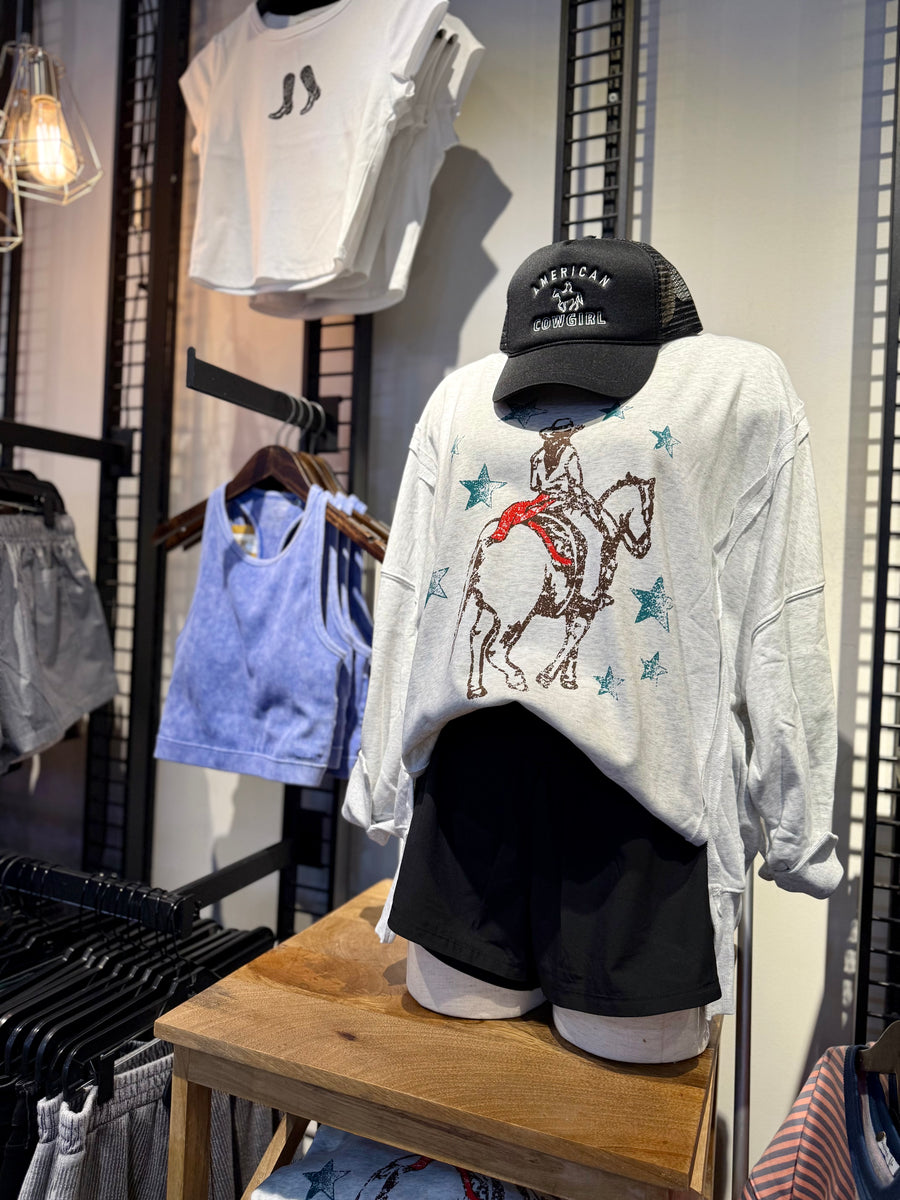 Stay cozy and trendy with our Gray Western cowboy graphic sweatshirt. With a relaxed fit and pullover design, this sweatshirt is perfect for any casual occasion. Stylish and comfortable, it's a must-have for your wardrobe.