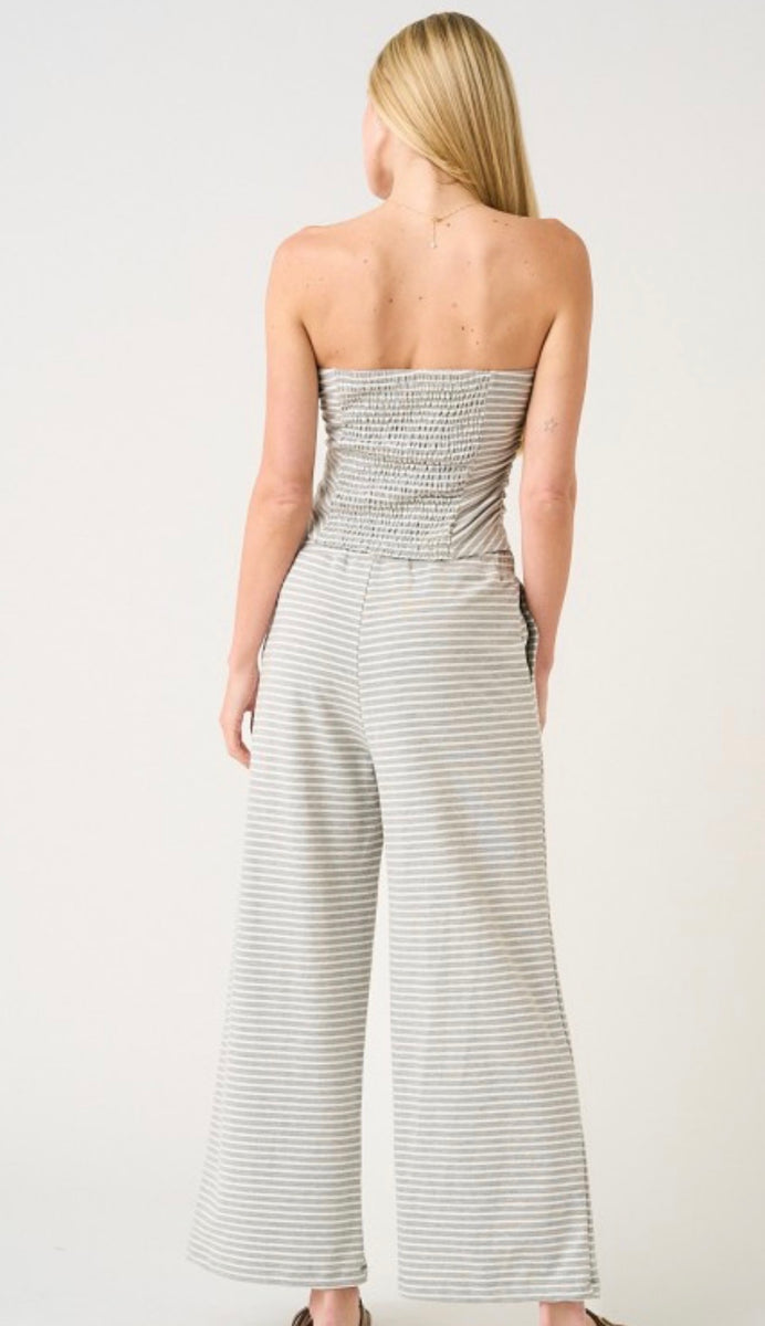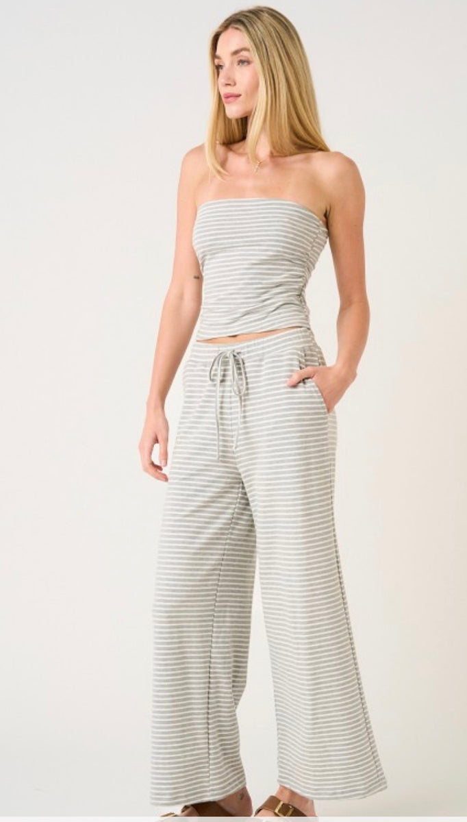Elevate your wardrobe with the 15591 gray and ivory stripe tube top and pants set. Designed to fit true to size, this stylish ensemble offers comfort and versatility, making it perfect for casual outings or relaxed gatherings.