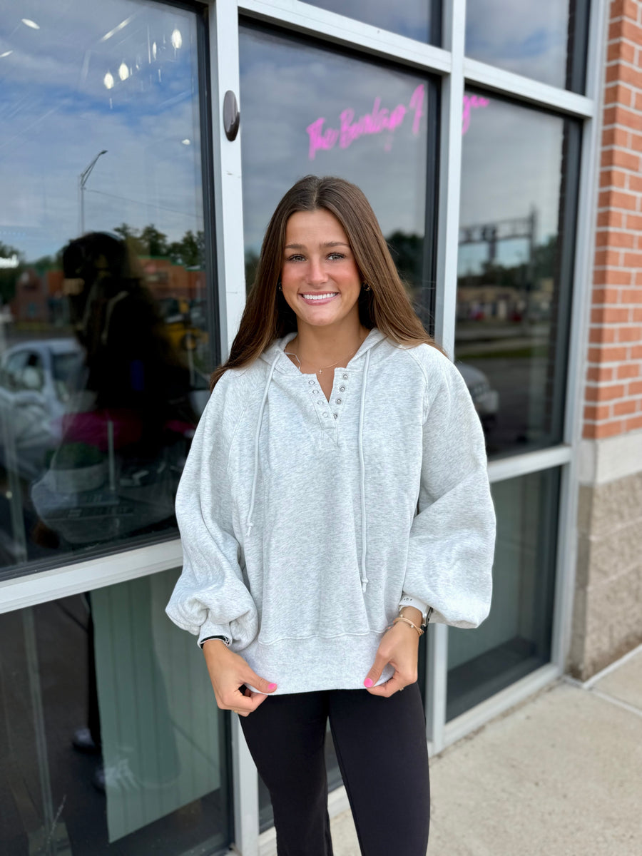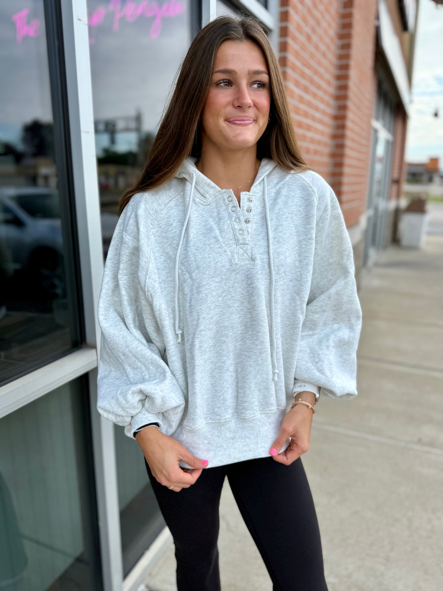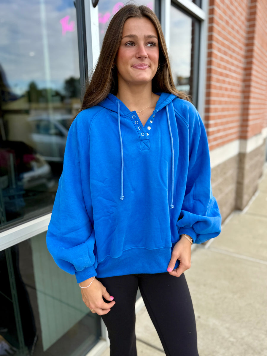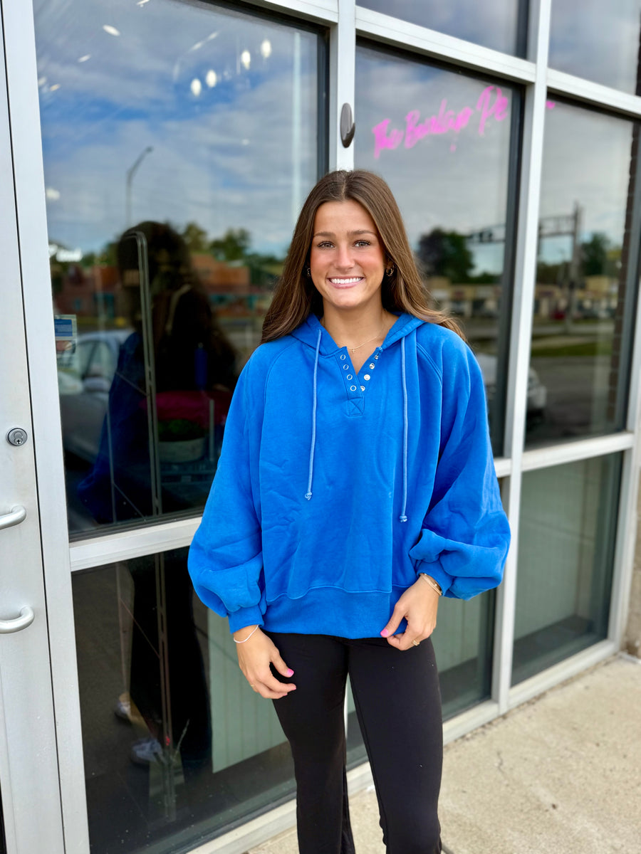 Stay cozy and comfortable in our Super Soft Hoodie! With a relaxed fit and convenient snap button closure, this sweatshirt is perfect for everyday wear. Available in both blue and gray, you'll want one in every color. Model is seen in size small.