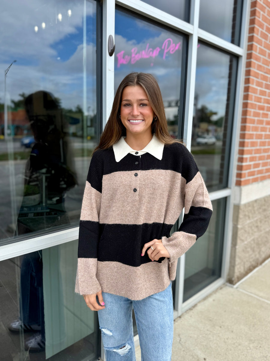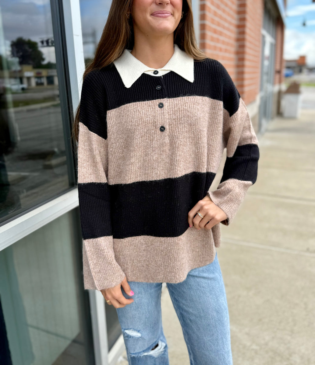 Comfort meets style with our Khaki and Black Rugby Stripe Pullover. Made from high quality knit material, this collar pullover is perfect for any casual occasion. The classic color combination adds a touch of sophistication to your wardrobe. Stay comfortable and fashionable with our 1949 pullover.