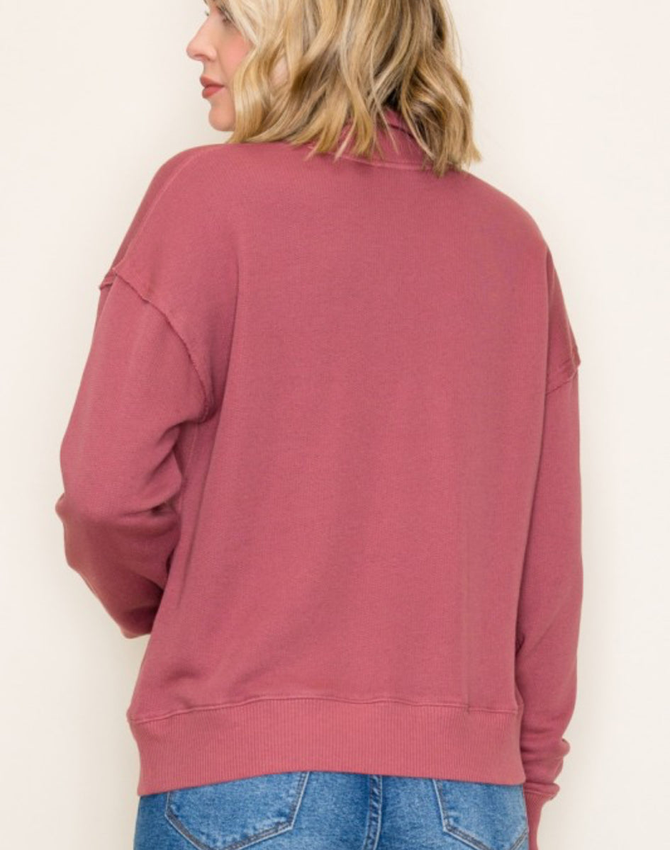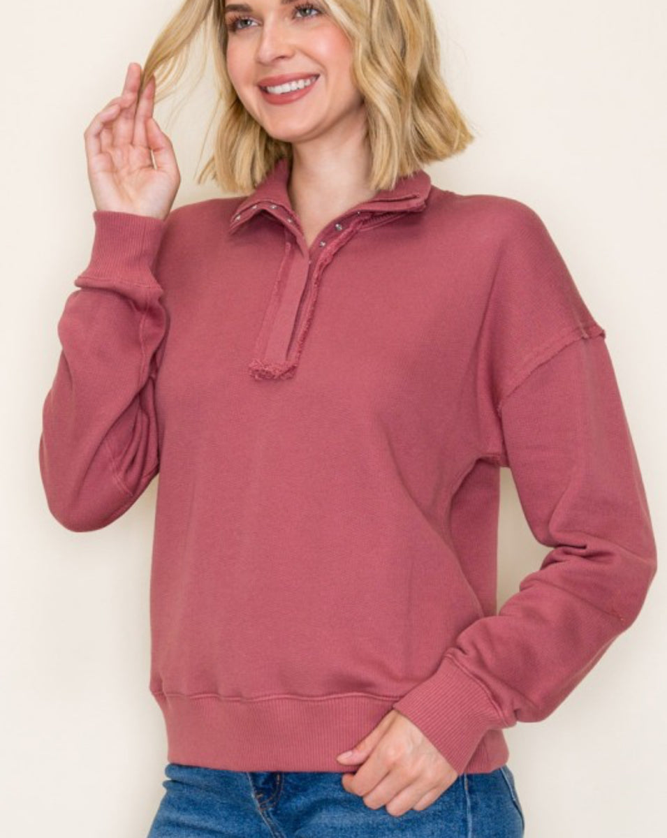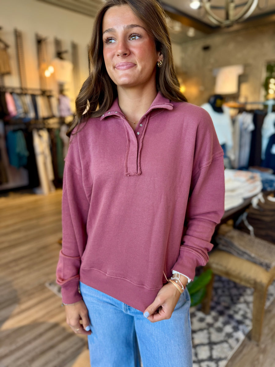 Effortlessly achieve a vintage, feminine look with our Mauve Pink Henley Pullover. Crafted from high-quality materials, this top boasts a flattering, true-to-size fit that will have you feeling confident and comfortable. Perfect for any occasion, this piece is a must-have addition to your wardrobe.