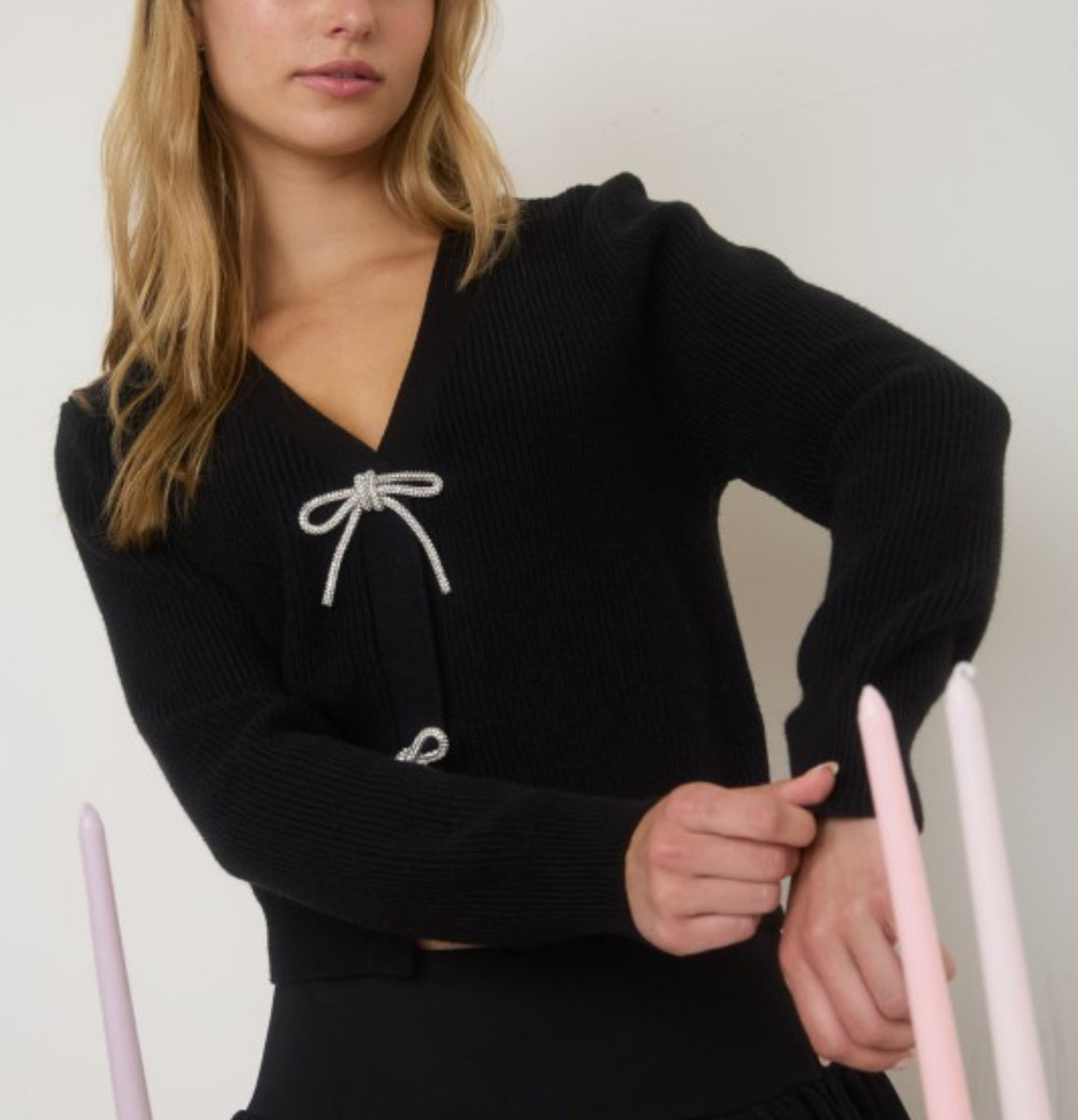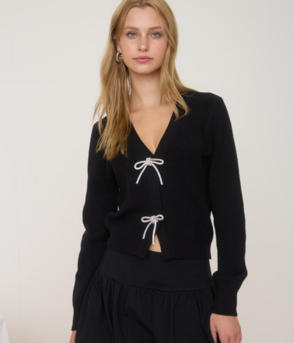 This black rhinestone bow button cardigan is a stylish addition to any outfit. With its chic design and high-quality rhinestones, it adds a touch of elegance to your look. The bow detailing adds a feminine touch while the buttons provide functionality. Stay warm and fashionable with 2065.
