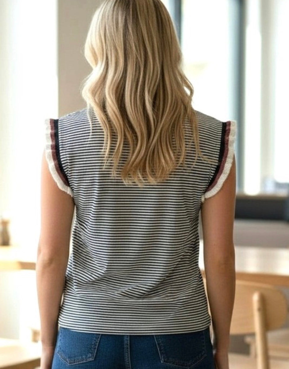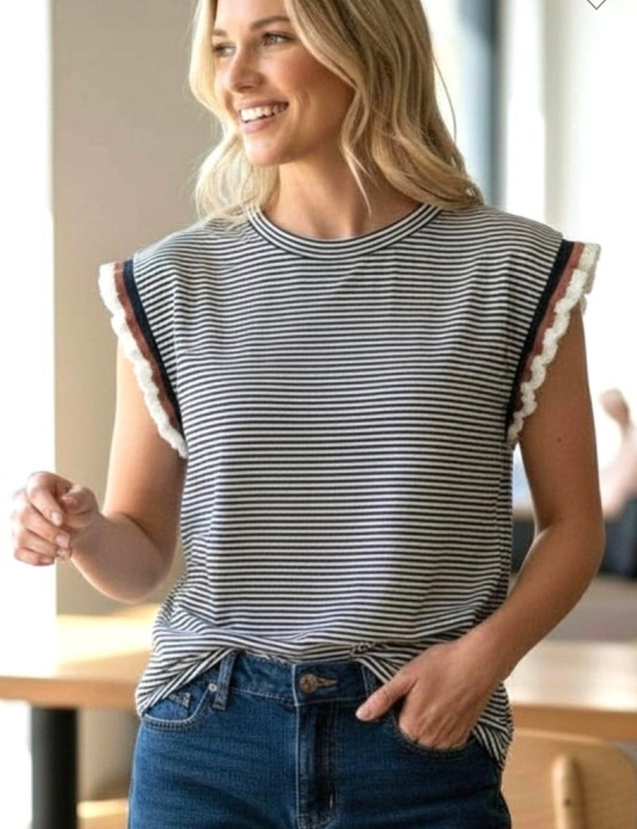 Add a touch of style to your wardrobe with the 20706 top. Featuring black stripe ruffle sleeves, it offers a playful yet chic look that elevates any outfit. Perfect for casual outings or dressing up, this top combines comfort and flair effortlessly.