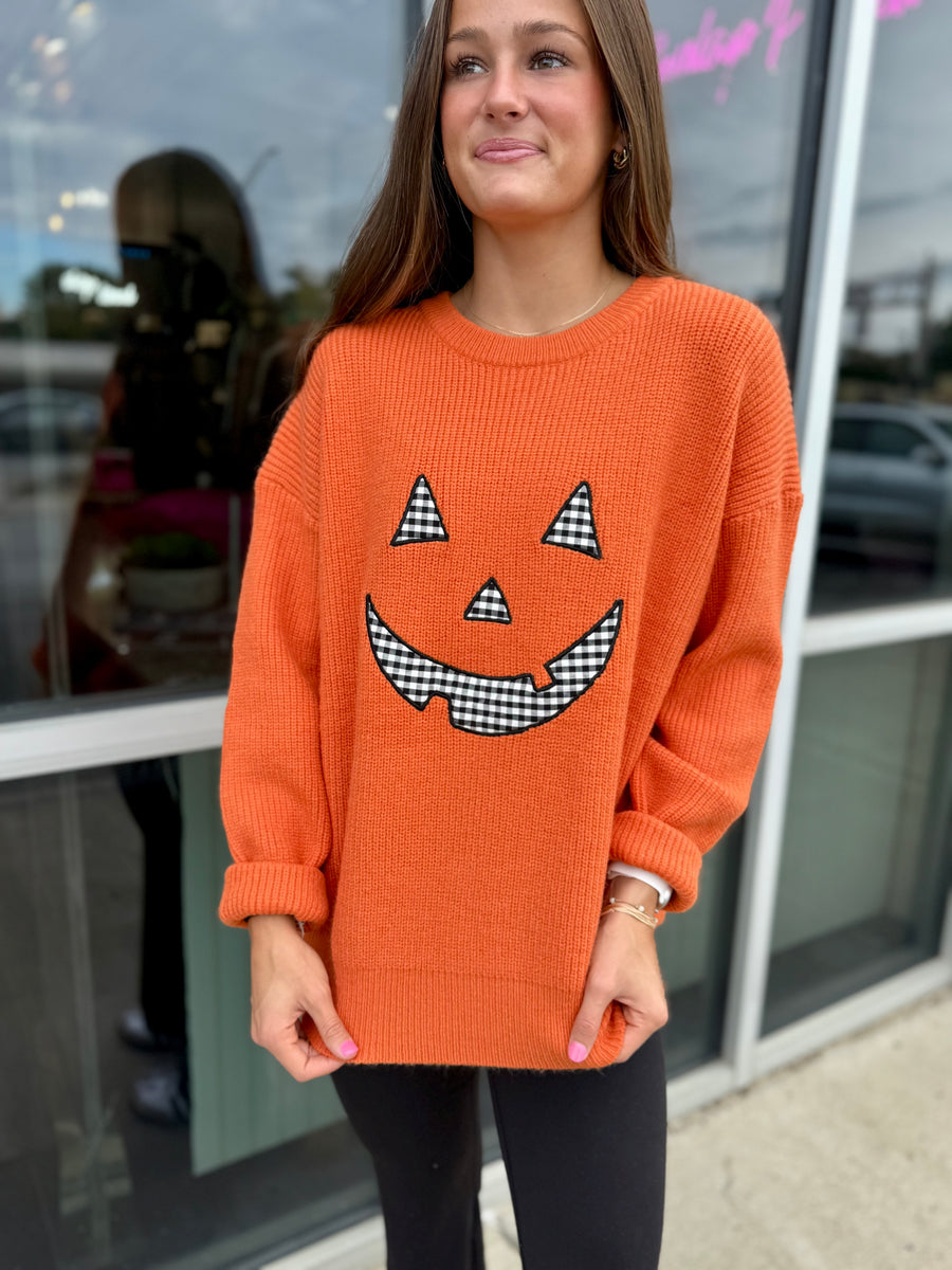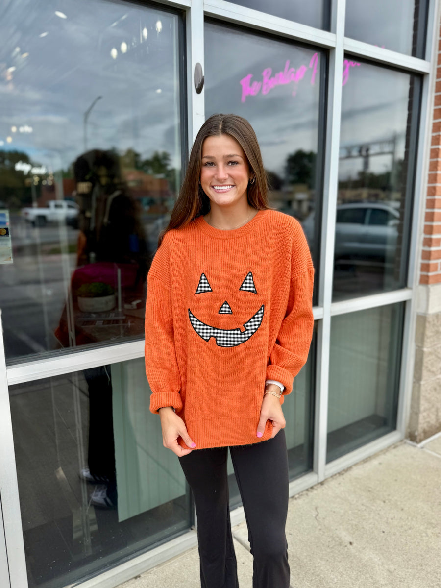 Stay cozy and stylish this fall with our charming 21010 orange ribbed knit pumpkin sweater. It features a playful black gingham pumpkin face that adds a touch of whimsy to any outfit. Perfect for autumn gatherings or festive outings, this sweater is sure to bring a smile to your face.