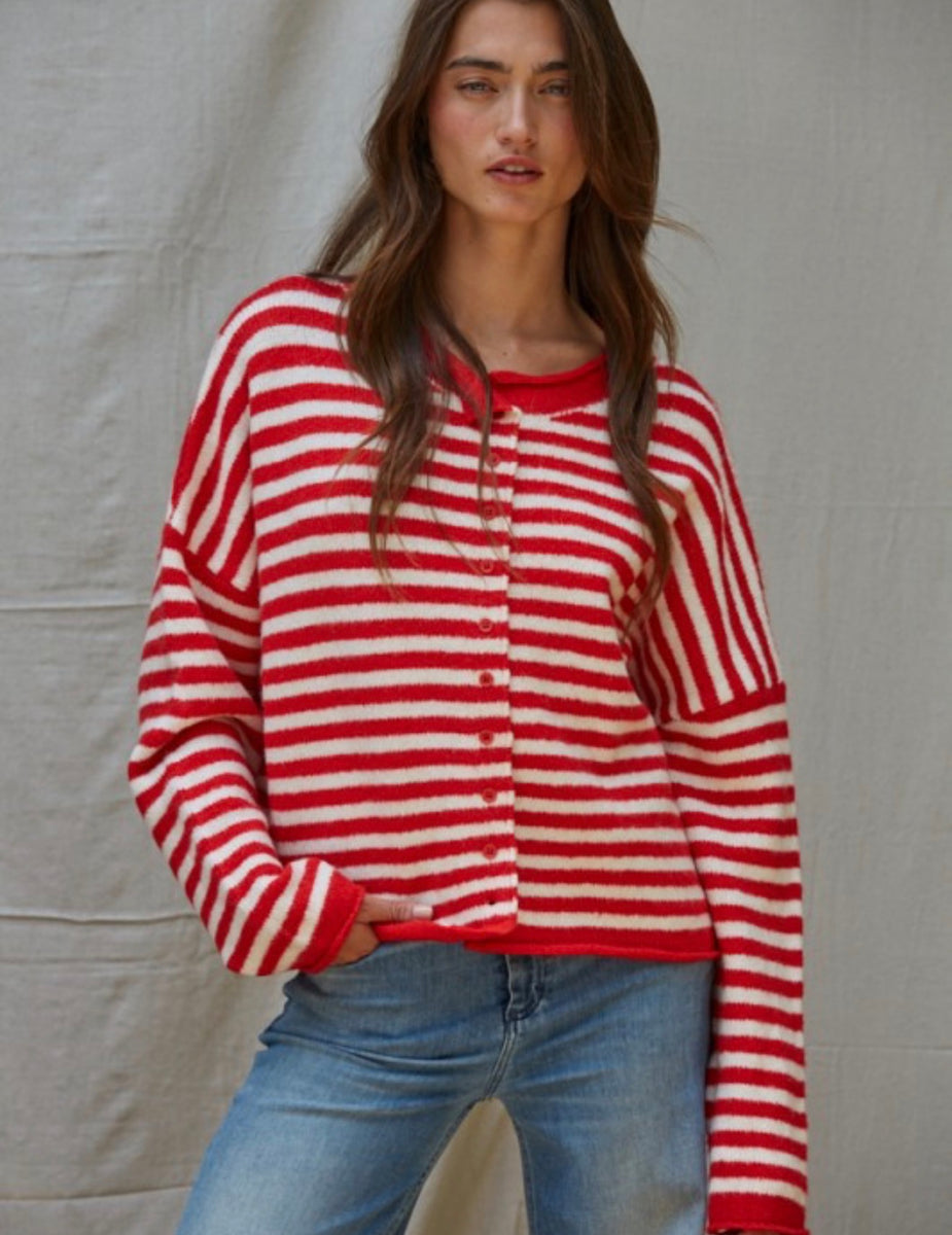 Stay stylish and cozy with this red and white stripe button down cardigan. Perfect for any occasion, its classic design adds a pop of color to any outfit. Keep warm and fashionable with this must-have addition to your wardrobe.