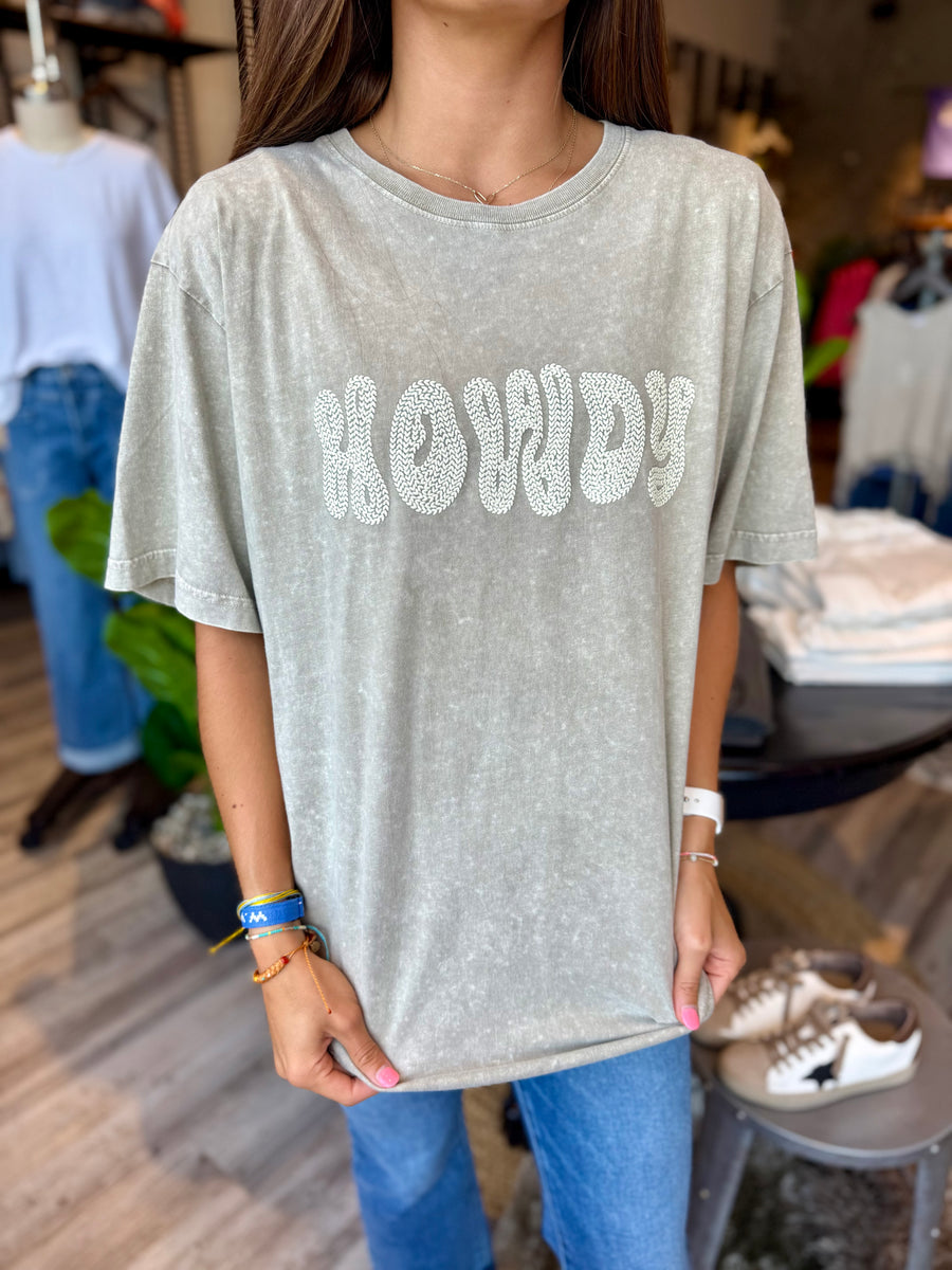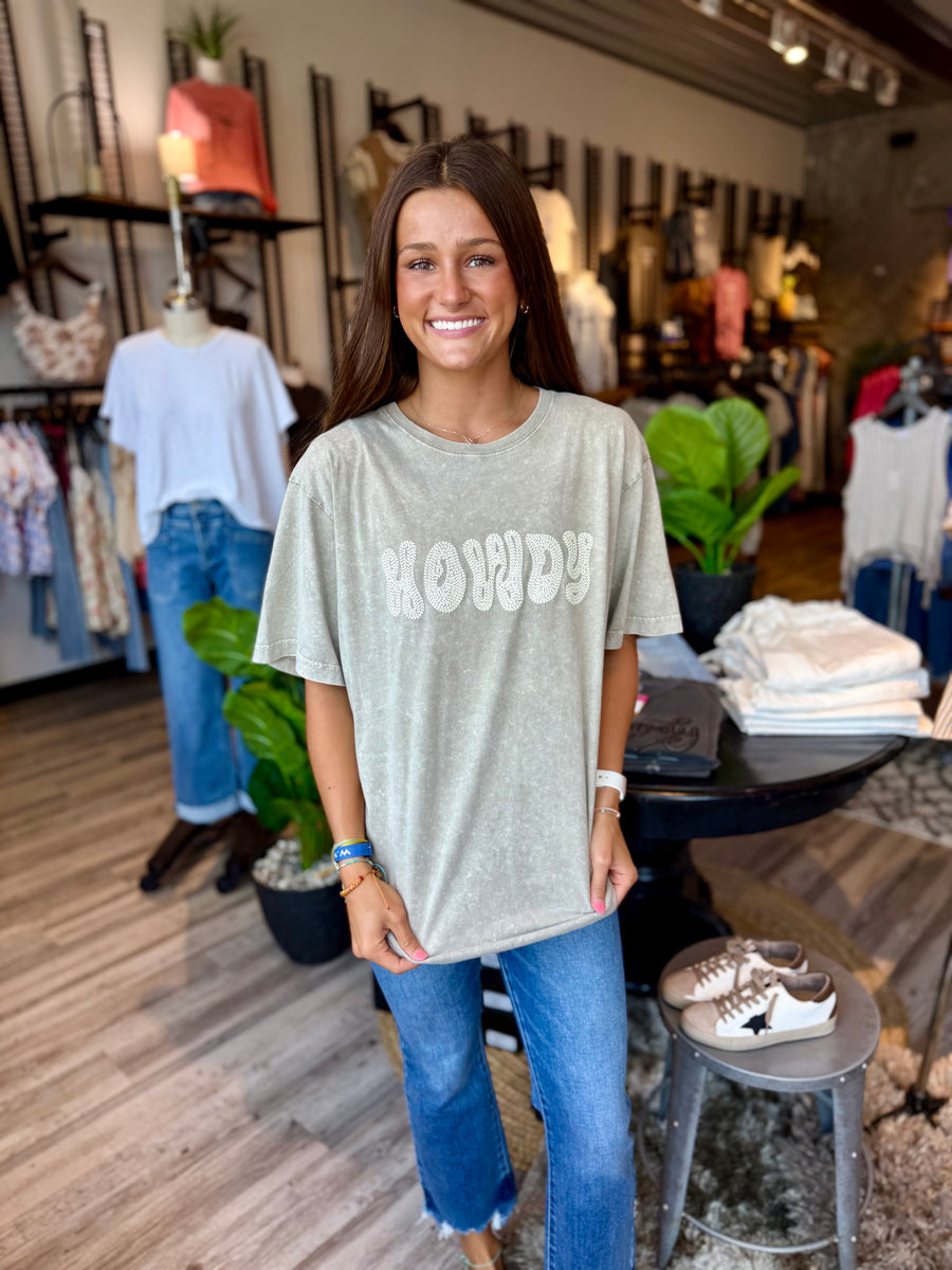 This easy-to-wear tee with a tan mineral wash finish features a cute "howdy!" graphic in puffed print. Its relaxed fit ensures all-day comfort.