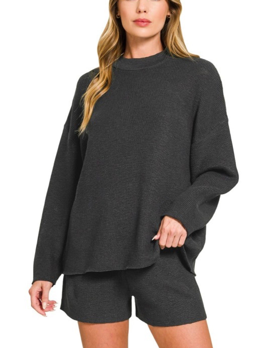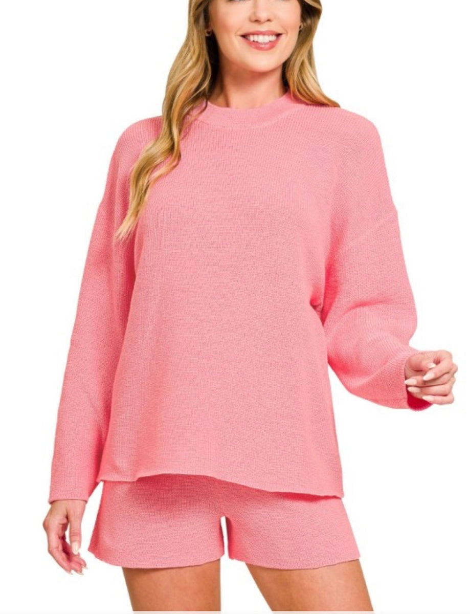 The 2634 sweater set features a cozy round neck design with options in pink, beige, or black. This versatile set includes both shorts and long sleeves, offering comfort and style for any casual occasion. Perfect for layering or wearing together for a chic look.