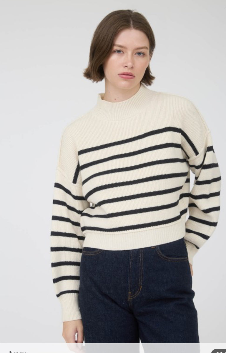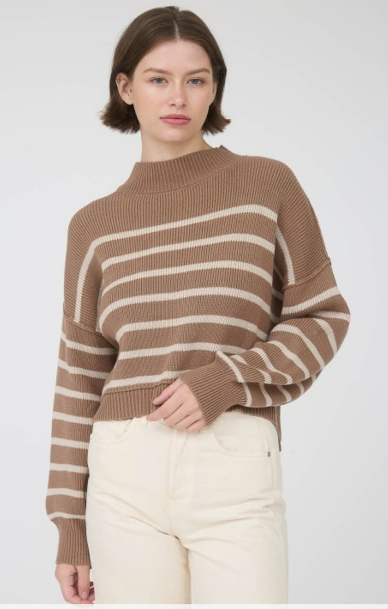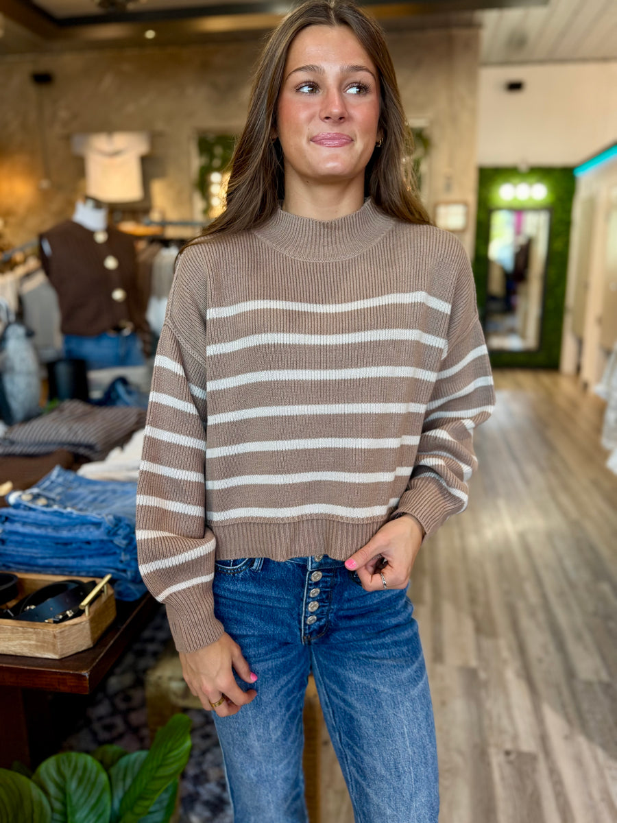 Stay cozy and stylish with our 2703 mock neck stripe sweater. Available in ivory or mocha, this versatile sweater is perfect for any occasion. Enjoy the comfort of a mock neck while looking effortlessly put together.