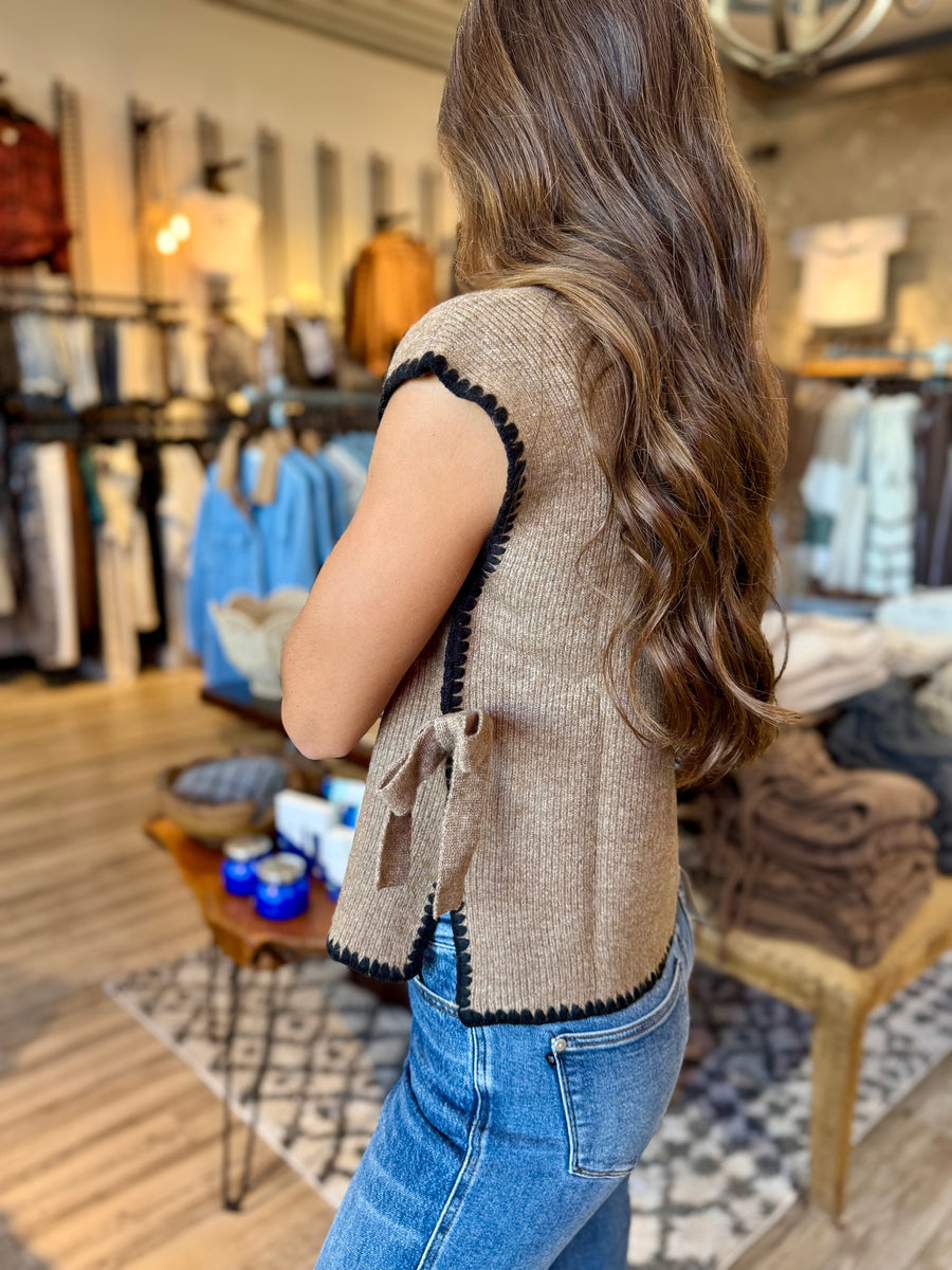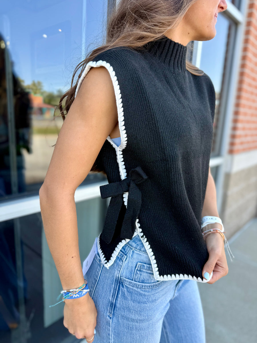Stay cozy and stylish with our versatile Ivory or Black side tie sweater vest. Designed with a comfortable fit and available in two classic colors, it's the perfect addition to your wardrobe. Stay warm and look great with ease in our must-have sweater vest.