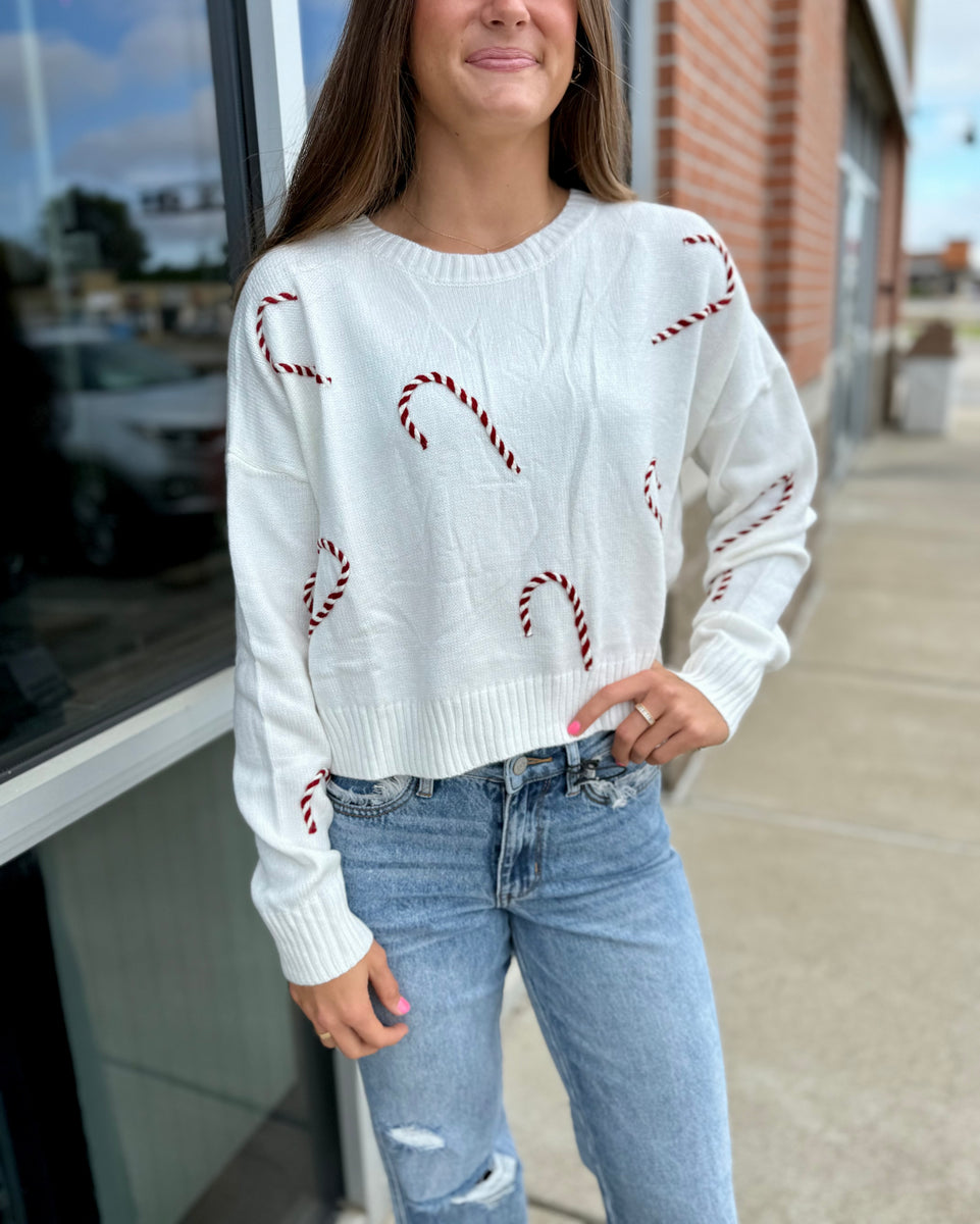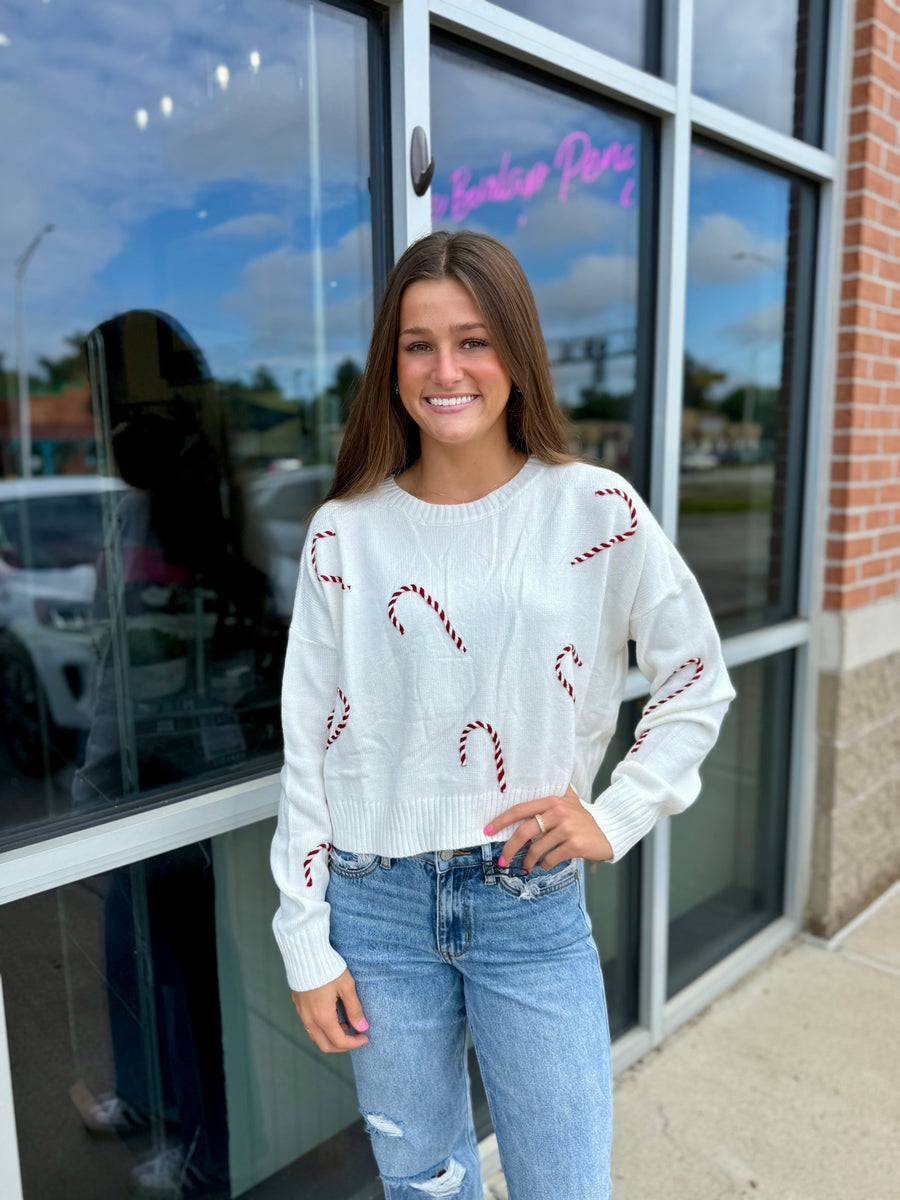 Get ready for the holidays with our ivory candy cane sweater! The cutest addition to your winter wardrobe. Available in size small-large it's perfect for spreading some holiday cheer.  Model seen in size small.