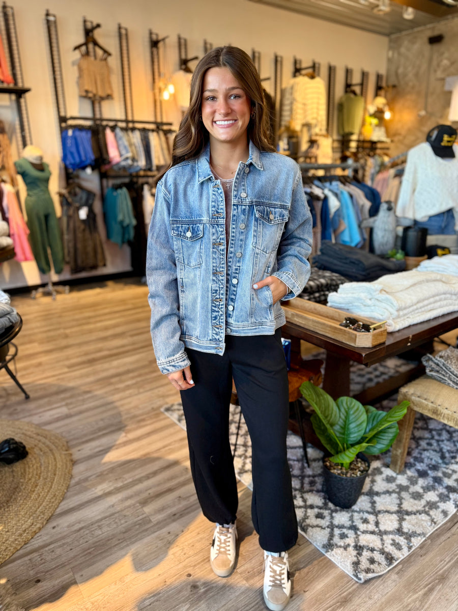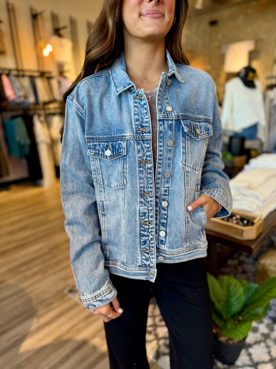 Introducing the Judy Blue Relaxed Rigid Jean Jacket. Made in a boyfriend style, this jacket is both stylish and comfortable. Perfect for any casual ensemble, it's the must-have addition to your wardrobe for effortless style.